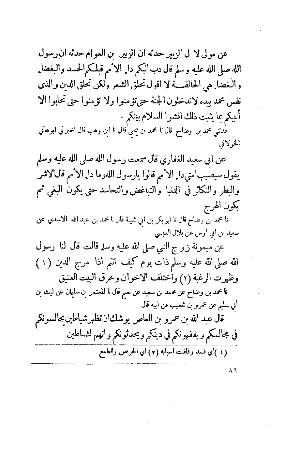 عن مولى لآل الزبير حدثه إن الزبير بن العوام حدثه إن رسول الله صلى الله عليه وسلم قال دب إليكم داء الأمم قبلكم الحسد والبغضاء والبغضاء هي الحالقة لا أقول تحلق الشعر ولكن تحلق الدين والذي نفس محمد بيده لا تدخلون الجنة حتى تؤمنوا ولا تؤمنوا حتى تحابوا ألا أنبيكم بما يثبت ذلك أفشوا السلام بينكم.