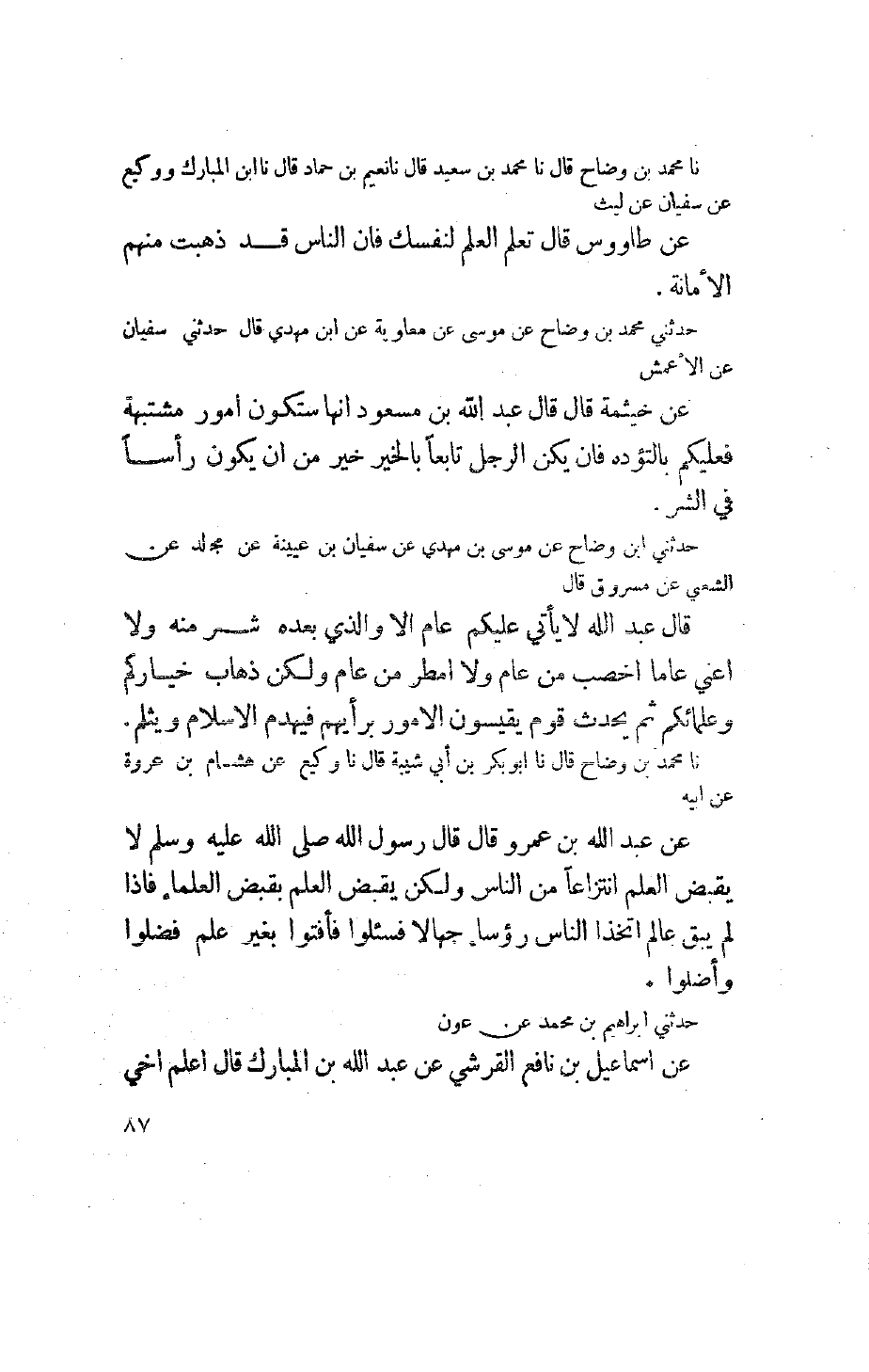 نا محمد بن وضاح قال نا أبو بكر بن أبي شيبة قال نا وكيع عن هشام بن عروة عن أبيه عن عبد الله بن عمرو قال قال رسول الله صلى الله عليه وسلم لا يقبض العلم انتزاعاً من الناس ولكن يقبض العلم بقبض العلماء فإذا لم يبقى عالم أتخذ الناس رؤساء جهالاً فسئلوا فأفتوا بغير علم فضلوا وأضلوا.