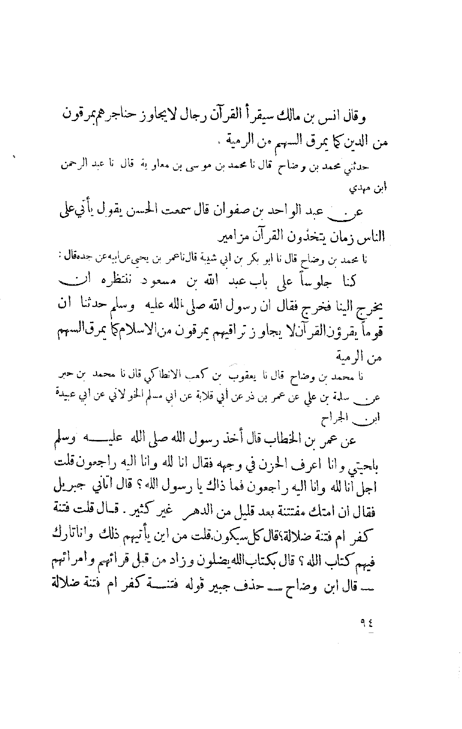 حدثني محمد بن وضاح قال نا محمد بن موسى بن معاوية قال نا عبد الرحمن أبن مهدي عن عبد الواحد بن صفوان قال سمعت الحسن يقول يأتي على الناس زمان يتخذون القرآن مزامير نا محمد بن وضاح قال نا أبو بكر بن أبي شيبة قال نا عمر بن يحيى عن أبيه عن جده قال: كنا جلوساً على باب عبد الله بن مسعود ننتظره أن يخرج إلينا فخرج فقال أن رسول الله صلى الله عليه وسلم حدثنا إن قوماً يقرؤون القرآن لا يجاوز تراقيهم يمرقون من الإسلام كما يمرق السهم من الرمية نا محمد بن وضاح قال نا يعقوب بن كعب الأنطاكي قال نا محمد بن حبر عن سلمة بن علي عن عمر بن ذر عن أبي قلابة عن أبي مسلم الخولاني عن أبي عبيدة أبن الجراح عن عمر بن الخطاب قال أخذ رسول الله صلى الله عليه وسلم بلحيتي وأنا أعرف الحزن في وجه فقال إنا لله وإنا إليه راجعون قلت أجل غنا لله وإنا إليه راجعون فما ذلك يا رسول الله? قال أتاني جبريل فقال إن أمتك مفتتنة بعد قليل من الدهر غير كثير. قال قلت فتنة كفر أم فتنة ضلالة? قال كل سيكون. قلت من أين يأتيهم ذلك وأنا تارك فيهم كتاب الله? قال بكتاب الله يضلون وزاد من قبل قرائهم وأمرهم- قال أبن وضاح- حذف جبير قوله فتنة كفر أم فتنة ضلالة