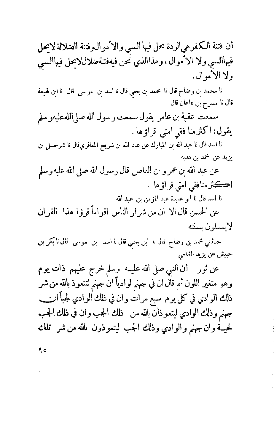 نا محمد بن وضاح قال محمد بن يحيى قال نا أسد بن موسى قال نا أبن لهيعة قال نا مسرح بن هاعان قال سمعت عقبة بن عامر يقول سمعت رسول الله صلى الله عليه وسلم يقول: أكثر منا فقي أمتي قراؤها.