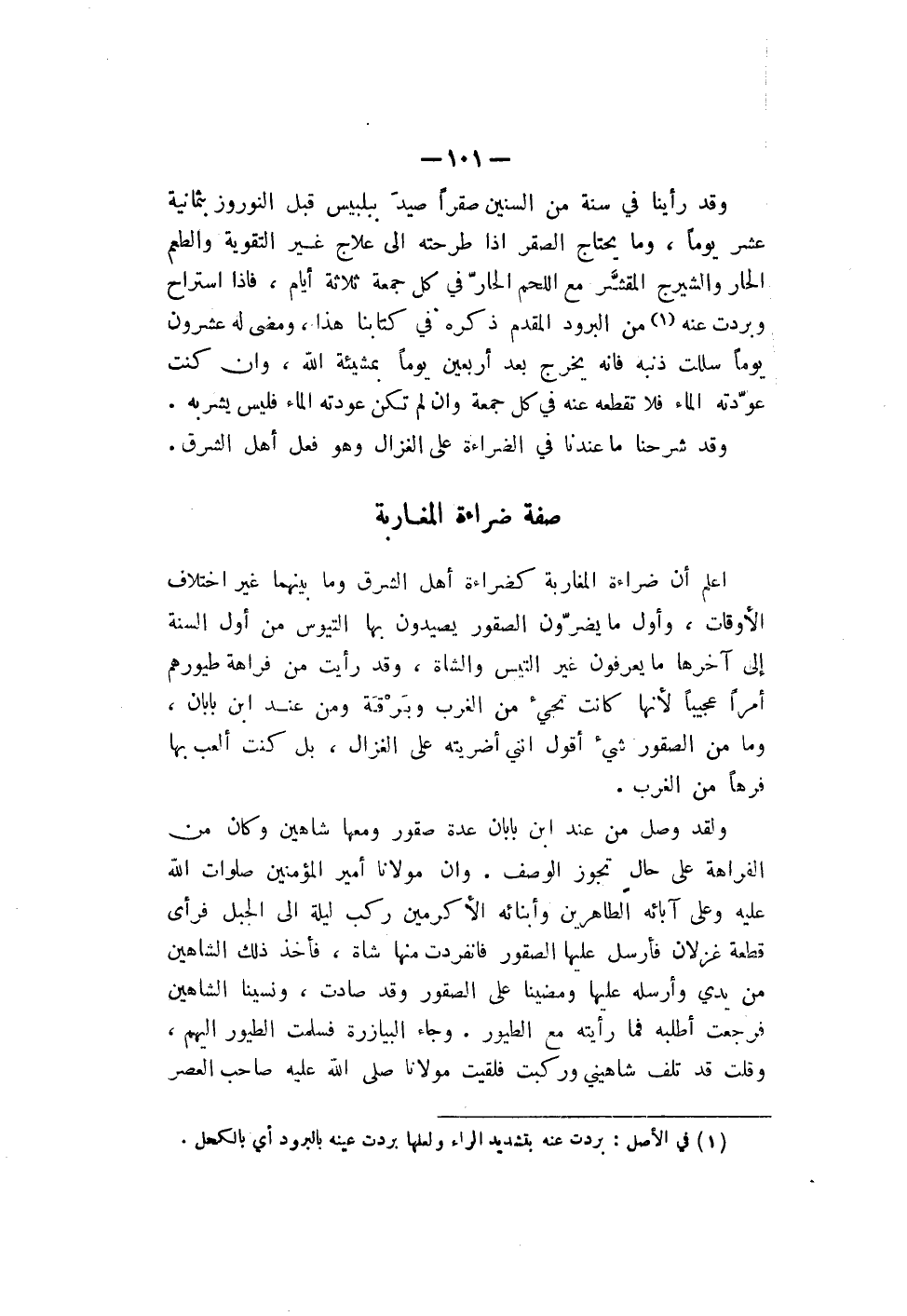 أعلم أن ضراءة المغاربة كضراءة أهل الشرق وما بينهما غير اختلاف الأوقات، وأول ما يضرّون الصقور يصيدون بها التيوس من أول السنة إلى آخرها ما يعرفون غير التيس والشاة، وقد رأيت من فراهة طيورهم أمراً عجيباً لأنها كانت تجيء من الغرب وبَرْقَة ومن عند ابن بابان، وما من الصقور شيء أقول أنني أضريته على الغزال، بل كنت ألعب بها فرهاً من الغرب.