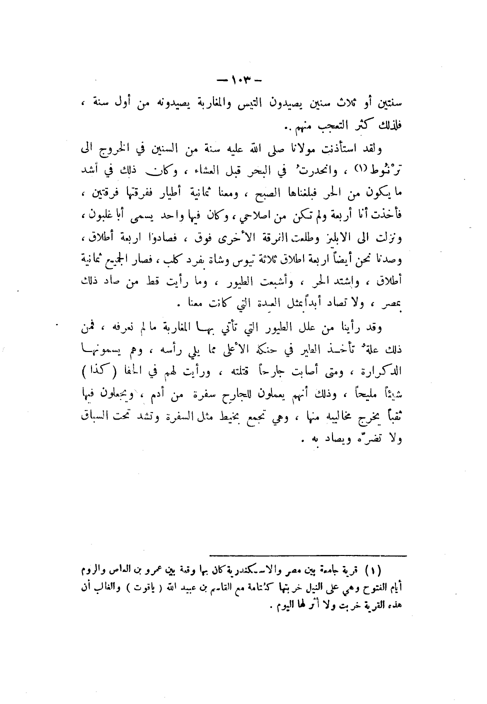 ولقد استأذنت مولانا صلى الله عليه سنة من السنين في الخروج إلى ترْنُوط، وانحدرتُ في البحر قبل العشاء، وكان ذلك في أشد ما يكون من الحر فبلغناها الصبح، ومعنا ثمانية أطيار ففرقتها فرقتين، فأخذت أنا أربعة ولم تكن من إصلاحي، وكان فيها واحد يسمى أبا غلبون، ونزلت إلى الابليز وطلعت الفرقة الأخرى فوق، فصادوا أربعة اطلاق، وصدنا نحن أيضاً أربعة اطلاق ثلاثة تيوس وشاة بفرد كلب، فصار الجميع ثمانية اطلاق، واشتد الحر، وأشبعت الطيور، وما رأيت قط من صاد ذلك بمصر، ولا تصاد أبداً بمثل العِدة التي كانت معنا.