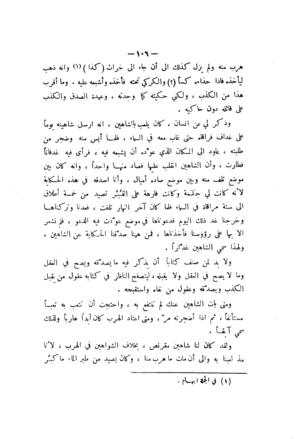 هرب منه ولم يزل كذلك أن جاء إلى خراث (كذا) وأنه ذهب ليأخذه فإذا حذاءه كساً (؟) والكركي تحته فأخذه وأشبعه عليه. وما أقرب هذا من الكذب، ولكني حكيته كما وجدته، وعهدة الصدق والكذب على قائله دون حاكيه.