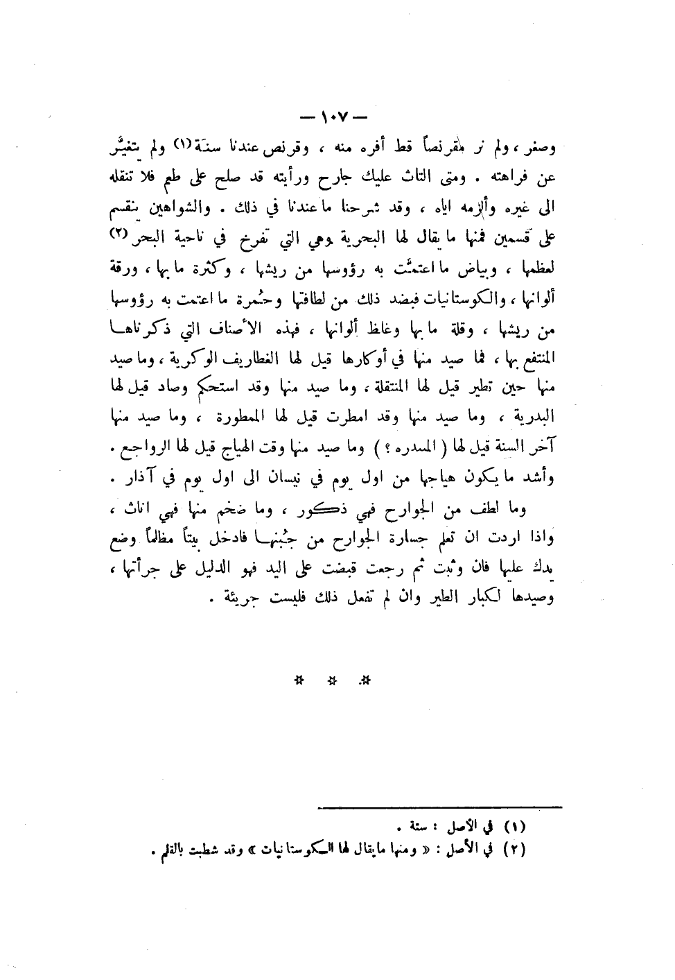 وصغر، ولم نر مقرنصاً قط أفره منه، وقرنص عندنا سنَئة ولم يتغيَّر عن فراهته. ومتى التاث عليك جارح ورأيته قد صلح على طعم فلا تنقله إلى غيره وألزمه إياه، وقد شرحنا ما عندنا في ذلك. والشواهين ينقسم على قسمين فمنها ما يقال لها البحرية وهي التي تفرخ في ناحية البحر لعظمها، وبياض ما اعتمَت به رؤوسها من ريشها، وكثرة ما بها، ورقة ألوانها، والكوستانيات فبضد ذلك من لطافتها وحُمرة ما اعتمت به رؤوسها من ريشها، وقلة ما بها وغلظ ألوانها، فهذه الأصناف التي ذكرناها المنتفع بها، فما صيد منها في أوكارها قيل لها الغطاريف الوكرية، وما صيد منها حين تطير قيل لها المنتقلة، وما صيد منها وقد استحكم وصاد قيل لها البدرية، وما صيد منها وقد أمطرت قيل لها الممطورة، وما صيد منها آخر السنة قيل لها (المسدرة؟) وما صيد منها وقت الهياج قيل لها الرواجع وأشد ما يكون هياجها من أول يوم في نيسان إلى أول يوم في آذار.
