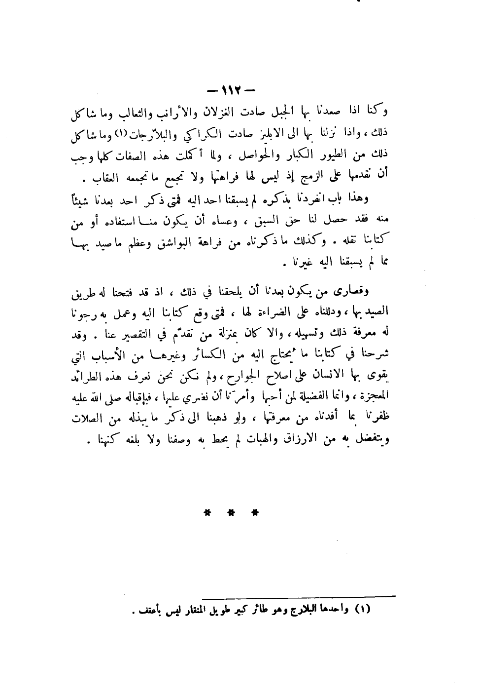 وهذا باب انفردنا بذكره لم يسبقنا أحد إليه فمتى ذكر أحد بعدنا شيئاً منه فقد حصل لنا حق السبق، وعساه أن يكون منا استفاده أو من كتابنا نقله. وكذلك ما ذكرناه من فراهة البواشق وعظم ما صيد بها مما لم يسبقنا إليه غيرنا.
