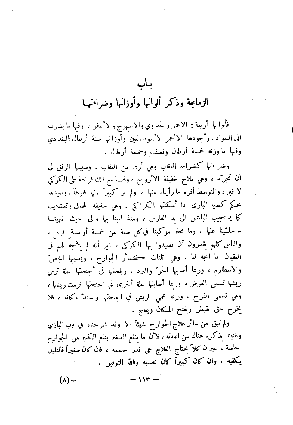 ولم نبق من سائر علاج الجوارح شيئاً إلا وقد شرحناه في باب البازي وغنينا بذكره هناك عن إعادته، لأن ما ينفع الصغير ينفع الكبير من الجوارح خاصة، غير أن كلاً يحتاج العلاج على قدر جسمه، فأن كان صغيراً فالقليل بكفيه، وأن كان كبيراً كان بحسبه وبالله التوفيق.