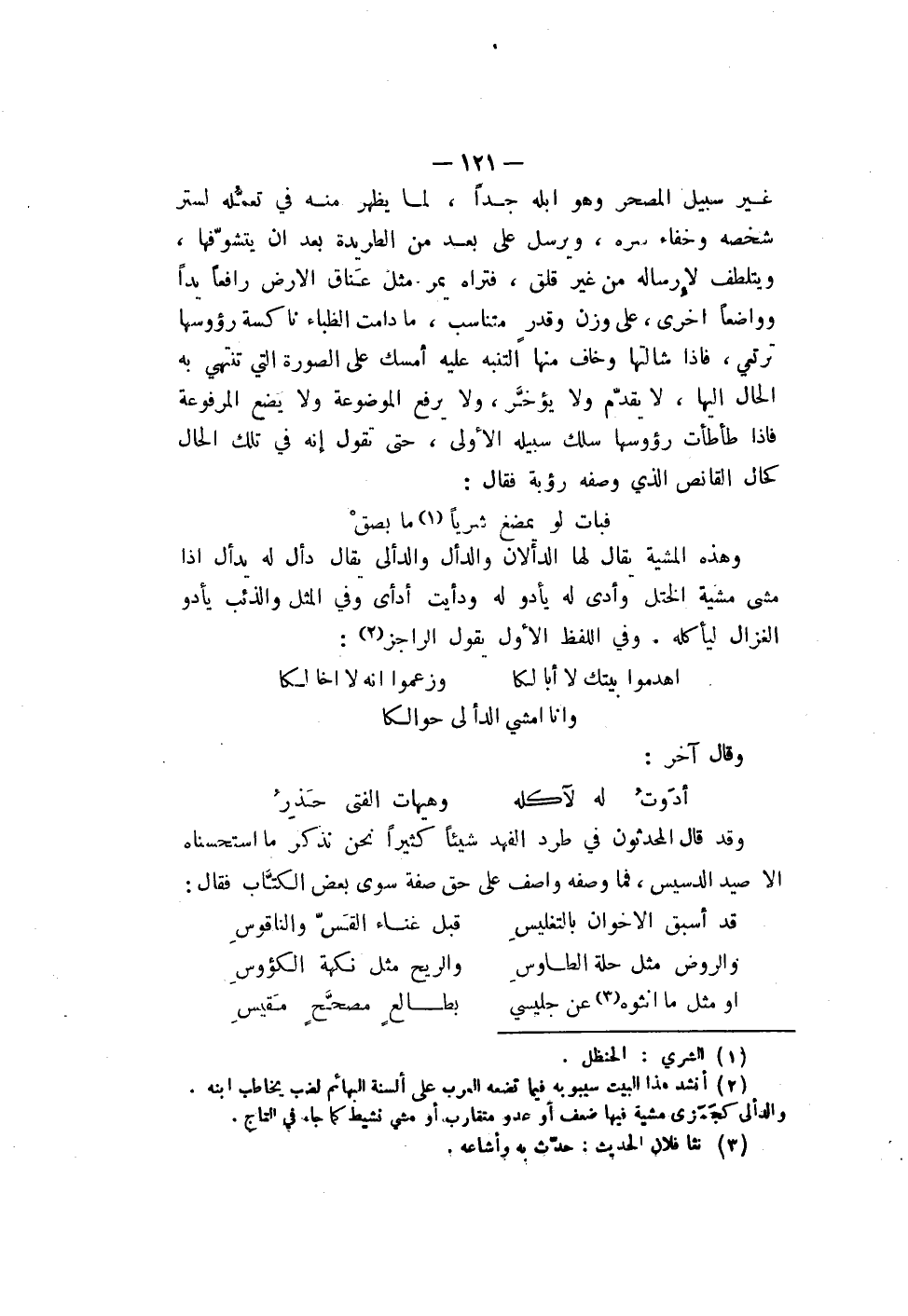 غير سبيل المصحر وهو ابله جداً، لما يظهر منه في تعمُّله لستر شخصه وخفاء سره، ويرسل على بعد من الطريدة بعد أن يتشوّفها، ويتلطف لإرساله من غير قلق، فتراه يمر مثل عَناق الأرض رافعاً يداً وواضعاً أخرى، على وزن وقدرٍ متناسب، ما دامت الظباء ناكسة رؤوسها ترتعي، فإذا شالتها وخاف منها التنبه عليه أمسك على الصورة التي تنتهي به الحال إليها، لا يقدم ولا يؤخَّر، ولا يرفع الموضوعة ولا يضع المرفوعة فإذا طأطأت رؤوسها سلك سبيله الأولى، حتى تقول إنه في تلك الحال كحال القانص الذي وصفه رؤبة فقال: