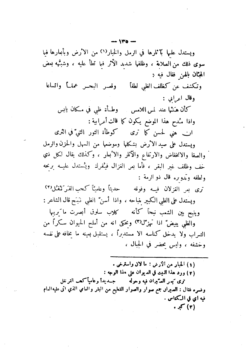 ويستدل عليها بآثارها في الرمل والخبار من الأرض وبأبعارها فيما سوى ذلك من الصلابة، وظلفها شديد الأثر فيما تطأ عليه، وشبهه بعض المجان بالهن فقال فيه: