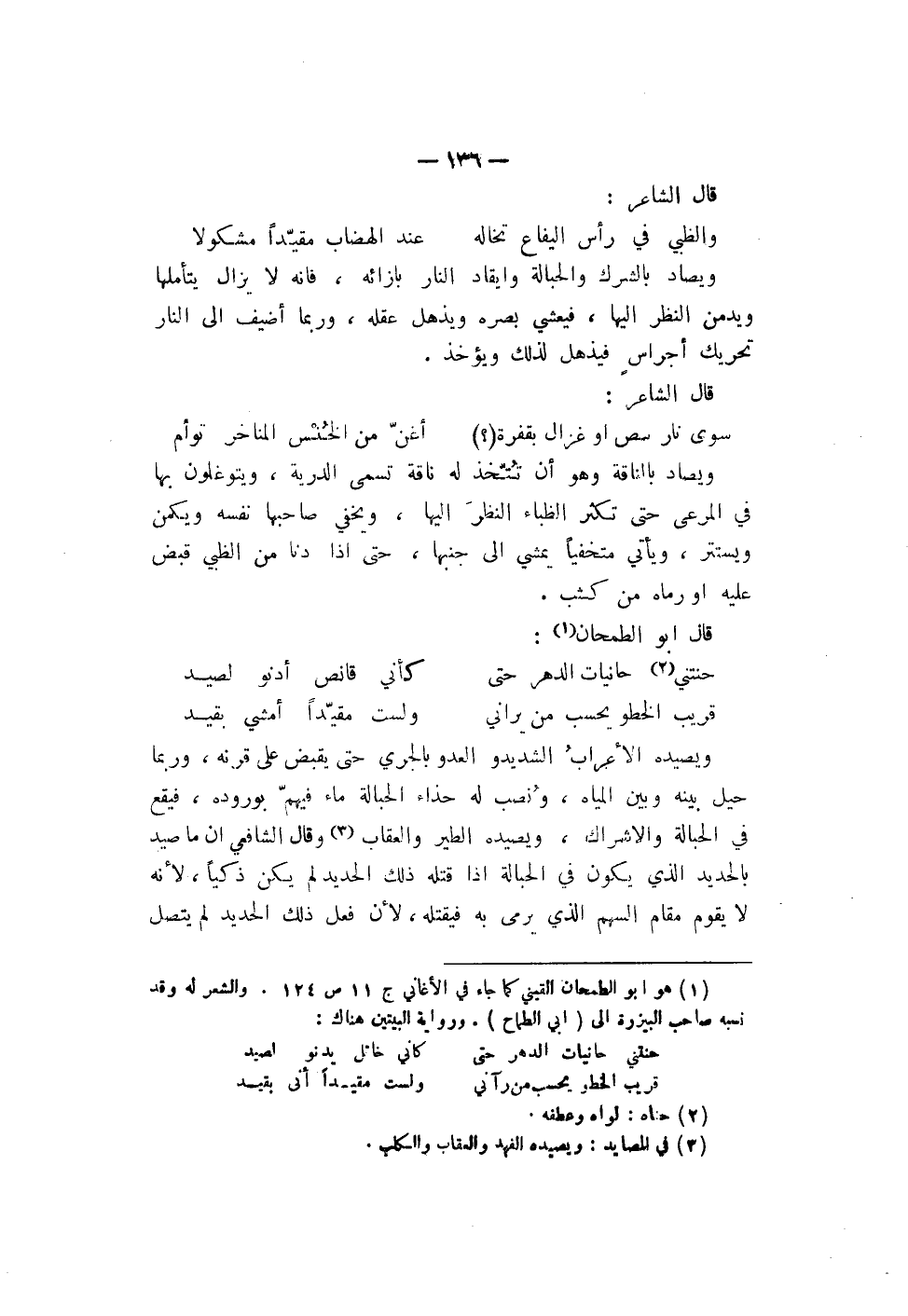 ويصاد بالشرك والحبالة وايقاد النار بازائه، فأنه لا يزال يتأملها ويدمن النظر إليه، فيعشي بصره ويذهل عقله، وربما أضيف إلى النار تحريك أجراسٍ فيذهل لذلك ويؤخذ.