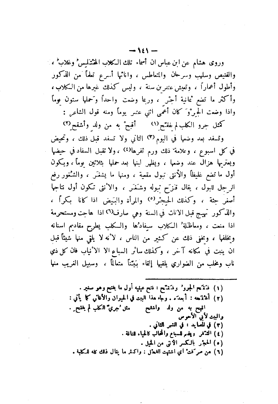 وتسفد بعد وضعها في اليوم الثاني ولا تسفد قبل ذلك، وتحيض في كل أسبوع، وعلامة ذلك ورم ثفرها، ولا تقبل السفاد في حيضها ويعتريها هزال عند وضعها، ويظهر لبنها بعد حملها بثلاثين يوماً، ويكون أول ما تضع غليظاً والأنثى تبول مقعية، ومنها ما يشغَر، والشُغور رفع الرِجل للبول، يقال قَزَح ببوله وشَغَر، والأنثى تكون أول نتاجها أصغر جثة، وكذلك الحِجْر والمرأة والبَيض إذا كانا بكراً، والذكور تهيج قبل الاناث في السنة وهي صارف إذا هاجت ومستحرمة إذا منعت، ومعاظّلةُ الكلاب سِفادُها والكلب يطرح مقاديم اسنانه ويخلفها، ويخفي ذلك عن كثير من الناس، لأنه لا يلقي منها شيئاً قبل أن ينبت في مكانه آخر، وكذلك سائر السباع إلا الأنياب فأن كل ذي ناب ومخلب من الضواري يلقيها إلقاء بَيّناً متعالماً، وسبيل الغريب منها