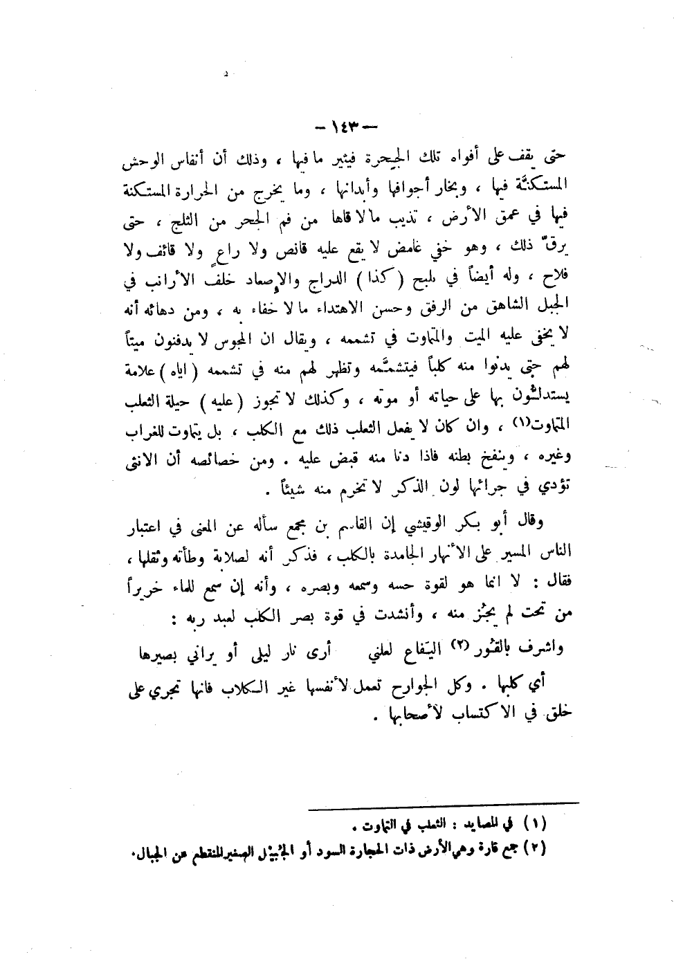 حتى يقف على أفواه تلك الجِحرة فيثير ما فيها، وذلك أن أنفاس الوحش المستكنَّة فيها، وبخار أجوافها وأبدانها، وما يخرج من الحرارة المستكنة فيها في عمق الأرض، تذيب ما لاقاها من فم الجحر من الثلج، حتى يرقّ ذلك، وهو خفي غامض لا يقع عليه قانص ولا راعٍ ولا قائف ولا فلاح، وله أيضاً في ملبح (كذا) الدراج والإصعاد خلف الأرانب في الجبل الشاهق من الرفق وحسن الاهتداء ما لا خفاء به، ومن دهائه أنه لا يخفى عليه الميت والمتماوت في تشممه، ويقال أن المجوس لا يدفنون ميتاً لهم حتى يدنوا منه كلباً فيتشمَّمه وتظهر لهم منه في تشممه (إياه) علامة يستدلُّون بها على حياته أو موته، وكذلك لا تجوز (عليه) حيلة الثعلب المتماوت، وأن كان لا يفعل الثعلب ذلك مع الكلب، بل يتماوت للغراب وغيره، وينفخ بطنه فإذا دنا منه قبض عليه. ومن خصائصه أن الأنثى تؤدي في جرائها لون الذكر لا تخرم منه شيئاً.