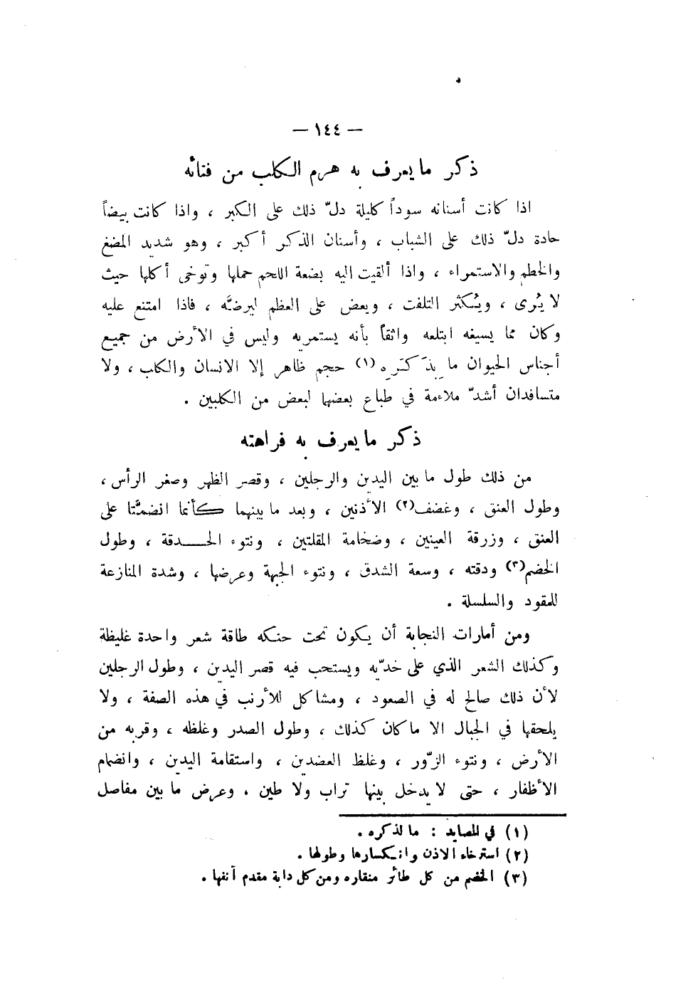 إذا كانت أسنانه سواداً كليلة دلّ ذلك على الكبر، وإذا كانت بيضاً حادة دلّ لك على الشباب، وأسنان الذكر أكبر، وهو شديد المضغ والخطم والاستمراء، وإذا ألقيت إليه بضعة اللحم وتوخى أكلها حيث لا يُرى، ويًكثر التلفت، ويعض على العظم ليرضَّه، فإذا امتنع عليه وكان مما يسيغه أبتلعه واثقاً بأنه يستمريه وليس في الأرض من جميع أجناس الحيوان ما بِذَكَرِه حجم ظاهر إلا الإنسان والكلب، ولا متسافدان أشدّ ملاءمة في طباع بعضهما لبعض من الكلبين.