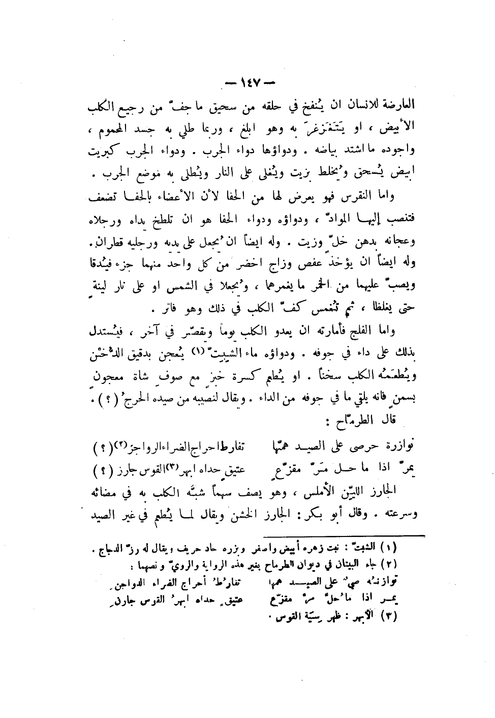 وأما النقرس فهو يعرض لها من الحفا لأن الأعضاء بالحفا تضعف فتنصب إليها الموادّ، ودواؤه دواء الحفا هو أن تلطخ يداه ورجلاه وعجانه بدهن خلّ وزيت. وله أيضاً أن يُجعل على يديه ورجليه قطران. وله أيضاً أن يؤخذ عفص وزاج أخضر من كل واحد منهما جزء فيُدقا ويصبّ عليهما من الخمر ما يغمرهما، ويُجعلا في الشمس أو على نار لينةٍ حتى يغلظا، ثم تُغمس كفّ الكلب في ذلك وهو فاتر.