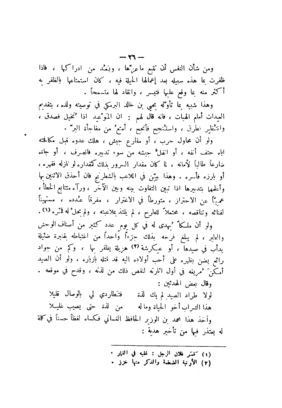 ولو أن محاول حرب، أو مقارع جيش، هلك عدوه قبل مكافحته إياه حتف أنفه، أو انفلَّ جيشه من سوء تدبيره فانصرف، أو جاءه ضاعاً طالباً لأمانه، لما كان مقدار السرور بذلك كمقداره لو نازله فقهره، أو بارزه فأسره. وهذا بين في الملاعب بالشطرنج فأن أحذق الاثنين بها وأعلمهما بتدبيرها إذا تبين التفاوت بينه وبين الآخر، ورآه متتابع الخطأ، عميّاً عن الاحتراز، متورطاً في الاغترار، مفرقاً عدده، مستهيناً لفنائه وتناقصه، محتملاً للطرح، لم يلتذ بملاعبته، ولم يحل له قمره.