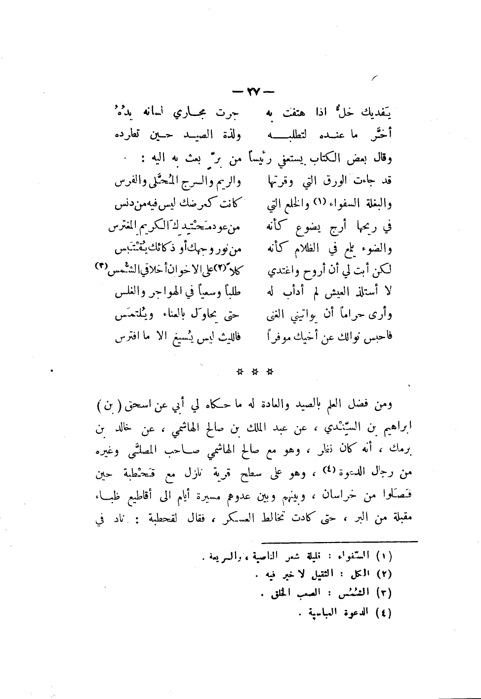 ومن فضل العلم بالصيد والعادة له ما حكاه لي أبي عن اسحق (بن) إبراهيم بن السندي، عن عبد الملك بن صالح الهاشمي، عن خالد بن برمك، أنه كان نظر، وهو مع صالح الهاشمي صاحب المصلَّى وغيره من رجال الدعوة، وهو على سطح قرية نازل مع قحطبة حين فصلوا من خرسان، وبينهم وبين عدوهم مسيرة أيام إلى أقاطيع ظباء مقبلة من البر، حتى كادت تخالط العسكر، فقال لقحطبة: ناد في