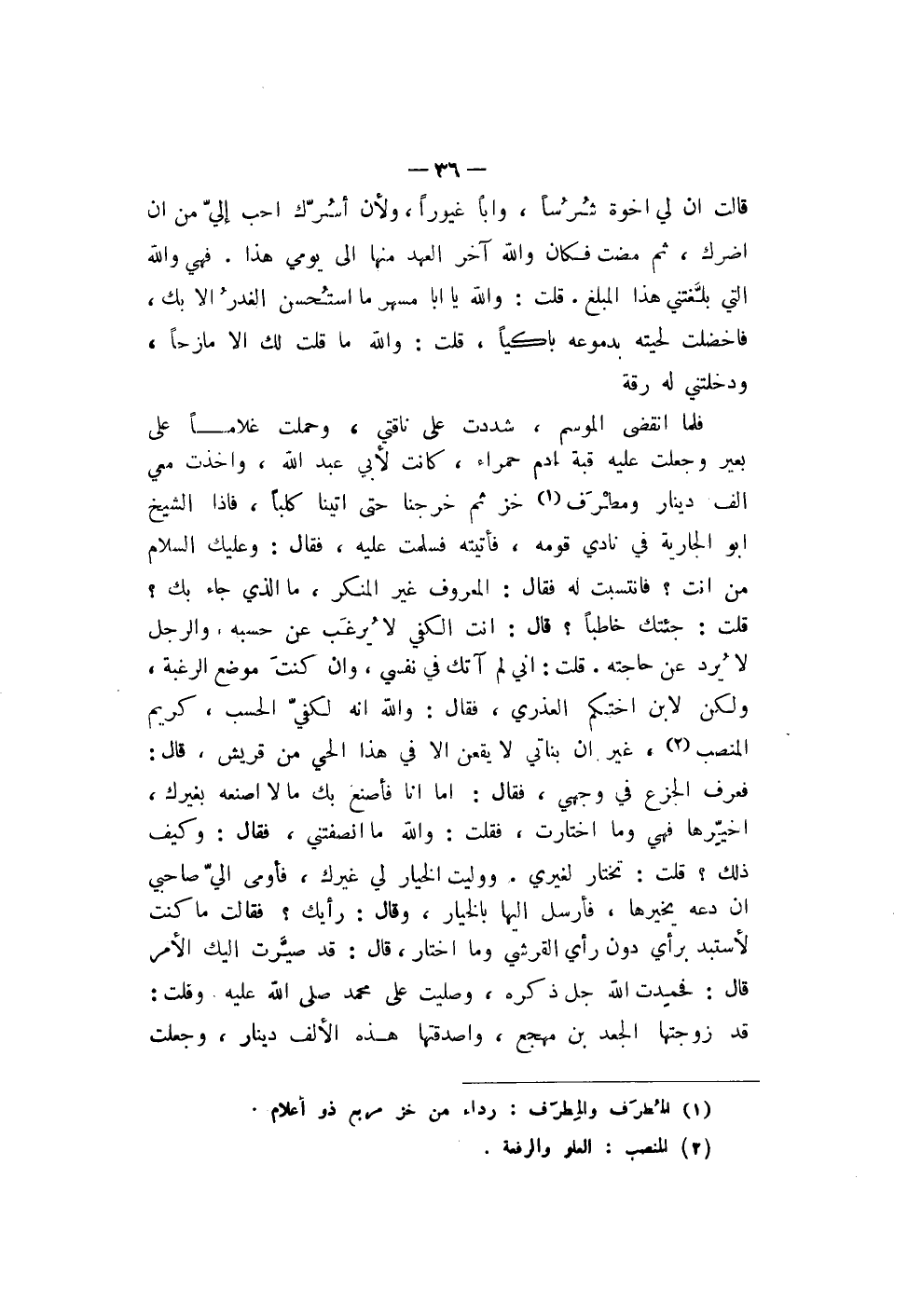 قالت إن لي أخوة شرساً، وأباً غيوراً، ولأن أسرك أحب إلي من أن أضرك، ثم مضت فكان والله آخر العهد منها إلى يومي هذا. فهي والله التي بلغتني هذا المبلغ. قلت: والله يا أبا مسهر ما استحسن الغدر إلا بك، فاخضلت لحيته بدموعه باكياً، قلت: والله ما قلت لك إلا مازحاً، ودخلتني له رقة فما انقضى الموسم، شددت على ناقتي، وحملت غلاماً على بعير وجعلت عليه قبة آدم حمراء، كانت لأبي عبد الله، وأخذت معي ألف دينار ومطرف خز ثم خرجنا حتى أتينا كلباً، فإذا الشيخ أبو الجارية في نادي قومه، فأتيته فسلمت عليه، فقال: وعليك السلام من أنت؟ فانتسبت له فقال: المعروف غير المنكر، ما الذي جاء بك! قلت: جئتك خاطباً؟ قال: أنت الكفي لا يرغب عن حسبه، والرجل لا يرد عن حاجته. قلت: إني لم آتك في نفسي، وإن كنت موضع الرغبة ولكن لابن أختكم العذري، فقال: والله أنه لكفيّ الحسب، كريم المنصب. غير أن بناتي لا يقعن إلا في هذا الحي من قريش، قال: فعرف الجزع في وجهي، فقال: أما أنا فأصنع بك ما لا أصنعه بغيرك، أخيرها فهي وما اختارت، فقلت: والله ما أنصفتني، فقال: وكيف ذلك؟ قلت: تختار لغيري. ووليت الخيار لي غيرك، فأومى إليّ صاحبي أن دعه يخيرها، فأرسل إليها بالخيار، وقال: رأيك؟ فقالت ما كنت لأستبد برأي دون رأي القرشي وما أختار، قال: قد صيرت إليك الأمر قال: فحمدت الله جل ذكره، وصليت على محمد صلى الله عليه وقلت: قد زوجتها الجعد بن مهجع، وأصدقتها هذا الألف دينار، وجعلت