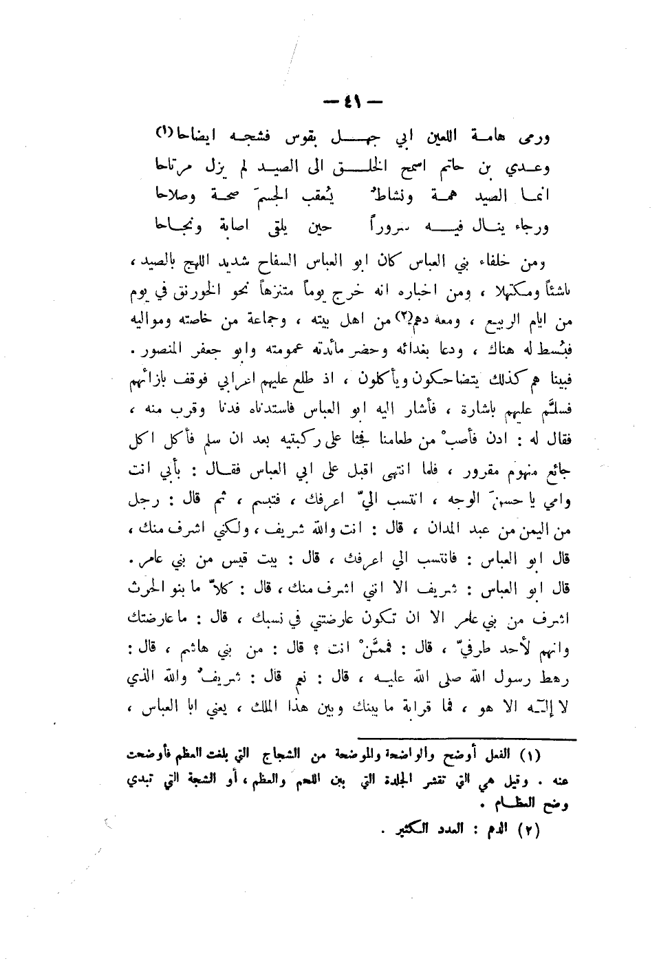 ومن خلفاء بني العباس كان أبو العباس السفاح شديد اللهج بالصيد، ناشئاً ومكتهلا، ومن أخباره أنه خرج يوماً متنزهاً نحو الخورنق في يوم من أيام الربيع، ومعه دهم من أهل بيته، وجماعة من خاصته ومواليه فبسط هناك ودعا بغدائه وحضر مائدته عمومته وأبو جعفر المنصور. فبينما هم كذلك يتضاحكون ويأكلون، إذ طلع عليهم أعرابي فوقف بازائهم فسلَّم عليهم بإشارة، فأشار إليه أبو العباس فاستدناه فدنا وقرب منه، فقال له: ادن فأصب من طعامنا فجثا على ركبتيه بعد أن سلم فأكل أكل جائع منهوم مقرور، فلما انتهى اقبل على أبي العباس فقال: بأبي أنت وأمي يا حسن الوجه، انتسب إليّ أعرفك، فتبسم، ثم قال: رجل من اليمن من عبد المدان، قال: أنت والله شريف، ولكني أشرف منك، قال أبو العباس: فانتسب إليه أعرفك، قال: بيت قيس من بني عامر. قال أبو العباس: شريف إلا أنني اشرف منك، قال: كلاّ ما بنو الحرث أشرف من بني عامر إلا أن تكون عارضتني في نسبك، قال: ما عارضتك وأنهم لأحد طرفيّ، قال: فممَّنْ أنت؟ قال: من بني هاشم، قال: رهط رسول الله صلى الله عليه، قال: نعم قال: شريفٌ والله الذي لا إله إلا هو، فما قرابة ما بينك وبين هذا الملك، يعني أبا العباس،