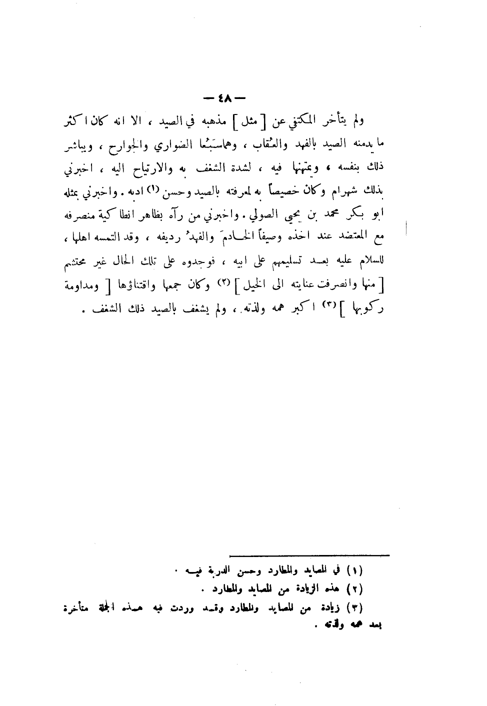 ولم يتأخر المكتفي عن (مثل) مذهبه في الصيد، إلا أنه كان أكثر ما يدمنه الصيد بالفهد والعُقاب، هما سَبُعا الضواري والجوارح، ويباشر ذلك بنفسه، ويمتهنها فيه، لشدة الشغف به والارتياح إليه، أخبرني بذلك شهرام وكان خصيصاً به لمعرفته وحسن أدبه. وأخبرني بمثله أبو بكر محمد بن يحيى الصولي. وأخبرني من رآه بظاهر إنطاكية منصرفة مع المعتضد عند أخذه وصيفاً الخادمَ والفهدُ رديفه، وقد التمسه أهلها، للسلام عليه بعد تسليمهم على أبيه، فوجدوه على تلك الحال غير محتشم (منها وانصرفت عنايته إلى الخيل) وكان جمعها واقتناؤها (ومداومة ركوبها) أكبر همة ولذته، ولم يشغف بالصيد ذلك الشغف.