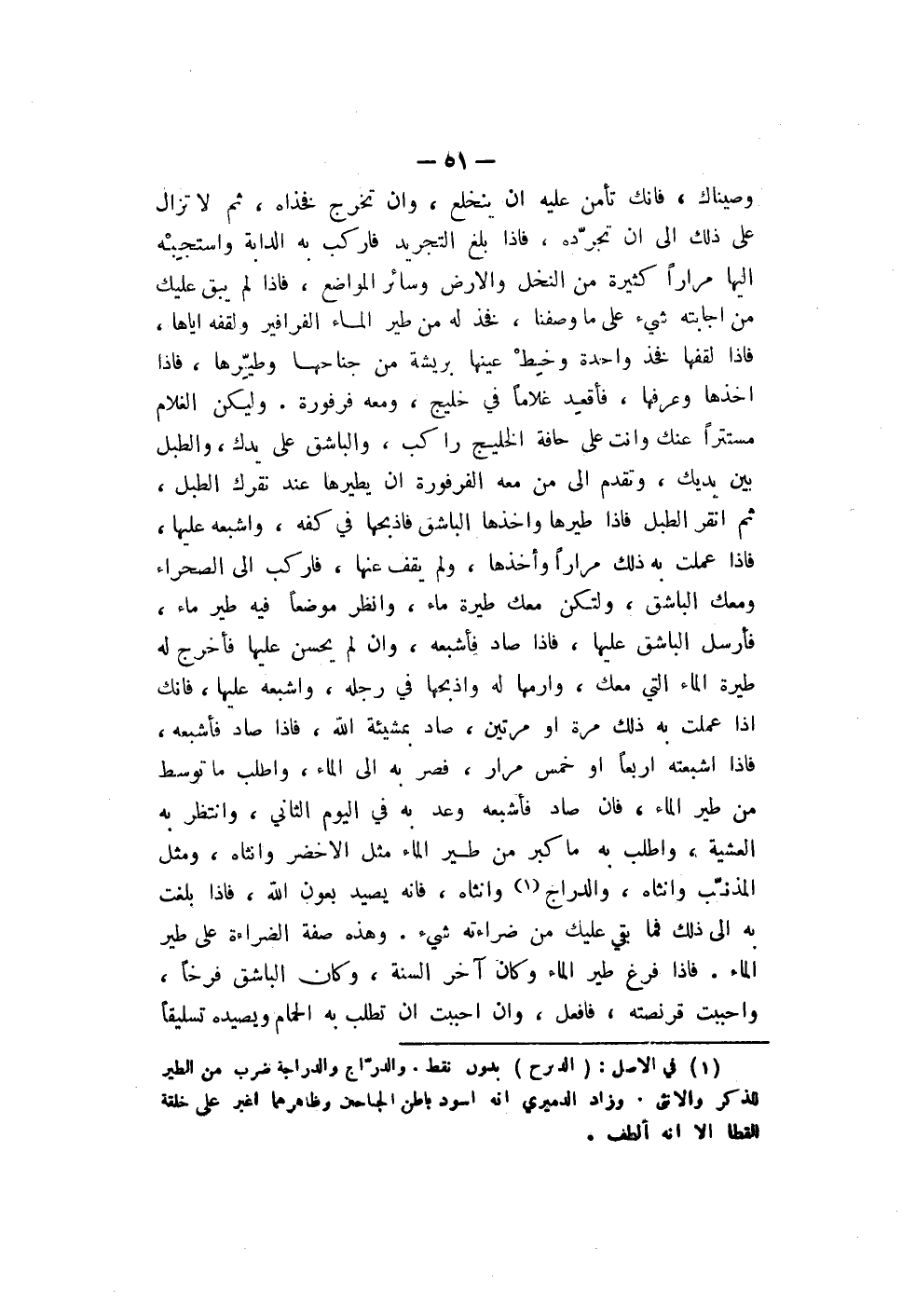 وصيناك، فأنك تأمن عليه أن ينخلع، وأن تخرج فخذاه، ثم لا تزال على ذلك إلى أن تجرّده، فإذا بلغ التجريد فأركب به الدابة واستجِبْه إليها مراراً كثيرة من النخل والأرض وسائر المواضع، فإذا لم يبق عليك من أجابته شيء على ما وصفنا، فخذ له من طير الماء الفرافير ولقفه إياها، فإذا لقفها فخذ واحدة وخِطْ عينها بريشة من جناحها وطِيّها، فإذا أخذها وعرفها، فأقعِد غلاماً في خليج، ومعه فرفورة. وليكن الغلام مستتراً عنك وأنت على حافة الخليج راكب، والباشق على يدك، والطبل بين يديك، وتقدم إلى من معه الفرفورة أن يطيرها عند نقرك الطبل، ثم أنقر الطبل فإذا طيرها وأخذها الباشق فاذبحها في كفه، وأشبعه عليها، فإذا عملت به ذلك مراراً وأخذها، ولم يقف عنها، فأركب إلى الصحراء ومعك الباشق، ولتكن معك طيرة ماء، وأنظر موضعاً فيه طير ماء، فأرسل الباشق عليها، فإذا صاد فأشبعه، وإن لم يحسن عليها فأخرج له طيرة الماء التي معك، وارمها له وأذبحها في رجله، وأشبعه عليها، فأنك إذا عملت به ذلك مرة أو مرتين، صاد بمشيئته الله، فإذا صاد فأشبعه، فإذا أشبعته أربعاً أو خمس مرار، فصر به إلى الماء، وأطلب ما توسط من طير الماء، فأن صاد فأشبعه وعد به في اليوم الثاني، وانتظر به العشية، واطلب به ما كبر من طير الماء مثل الأخضر وأنثاه، ومثل المذنّب وأنثاه، والدراج وأنثاه، فأنه يصيد بعون الله، فإذا بلغت به إلى ذلك فما بقي عليك من ضراءته شيء. وهذه صفة الضراءة على طير الماء. فإذا فرغ طير الماء وكان آخر السنة، وكان الباشق فرخاً، وأحببت قرنصته، فأفعل، وأن أحببت أن تطلب به الحمام ويصيده تسليقاً