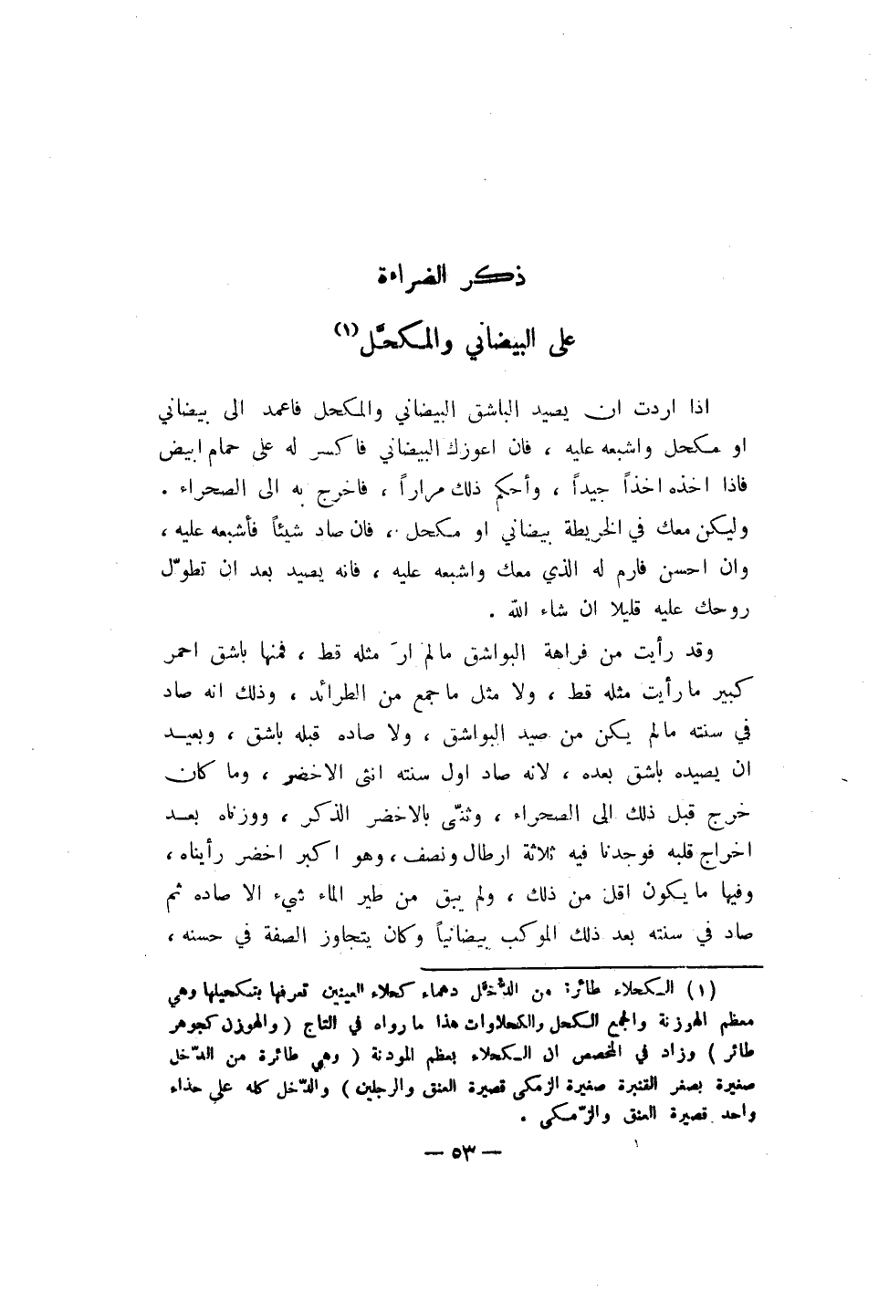 إذا أردت أن يصيد الباشق البيضاني والمحكل فأعمد إلى بيضاني أو مكحل وأشبعه عليه، فأن أعوزك البيضاني فأكسر له على حمام أبيض فإذا أخذه أخذاً جيداً، وأحكم ذلك مراراً، فأخرج به إلى الصحراء. وليكن معك في الخريطة بيضاني أو مكحل، فأن صاد شيئاً فأشبعه عليه، وأن أحسن فأرم له الذي معك وأشبعه عليه، فأنه يصيد بعد أن تطوّل روحك عليه قليلاً إن شاء الله.