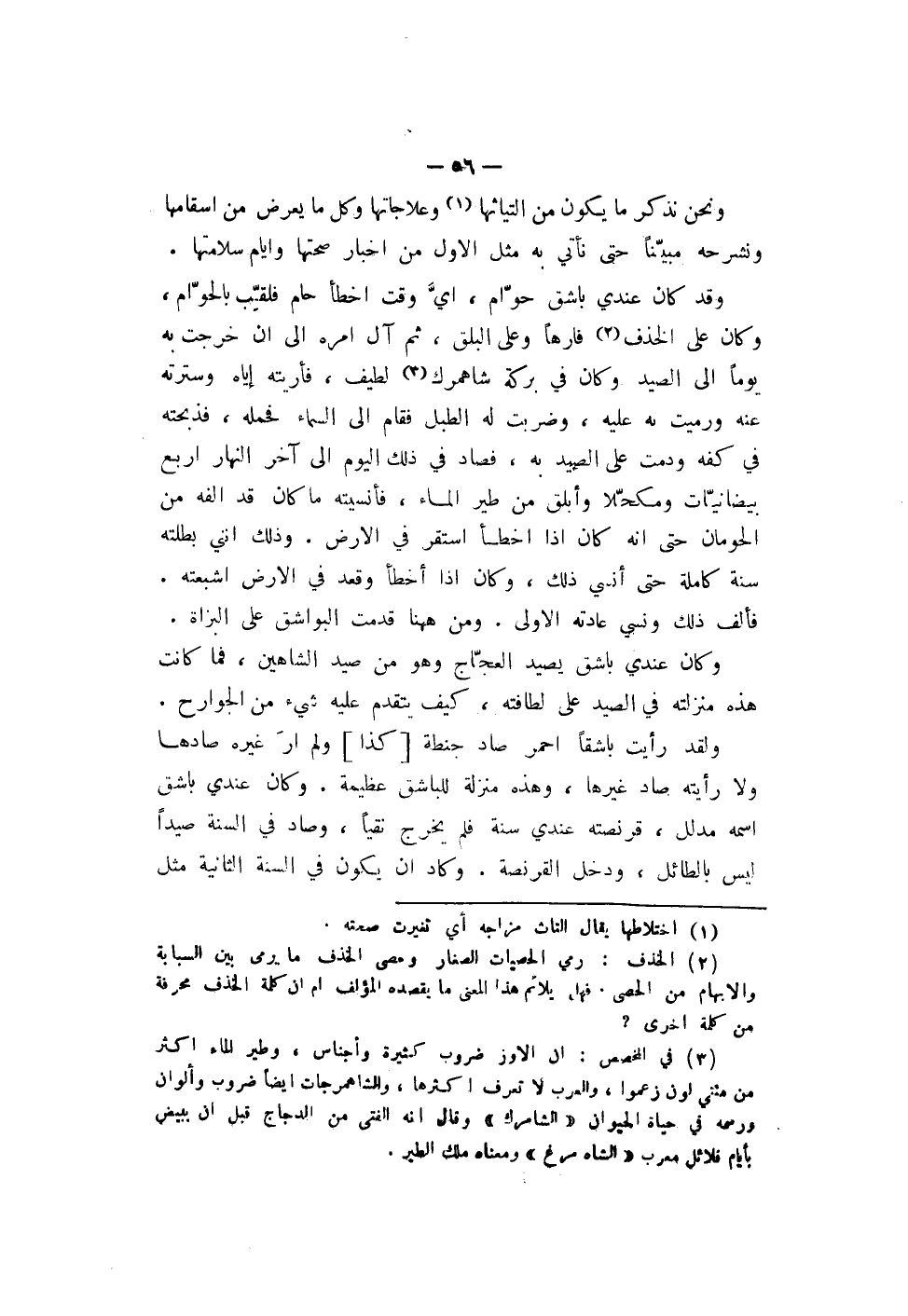 وقد كان عندي باشق حوّام، أي وقت أخطأ حام فلّقِب بالحوّم، وكان على الحذف فارهاً وعلى البلق، ثم آل أمره إلى أن خرجت به يوماً إلى الصيد وكان في بركة شاهمرك لطيف، فأريته إياه وسترته عنه ورميت به عليه، وضربت له الطبل فقام إلى السماء فحمله، فذبحته في كفه ودمت على الصيد به، فصاد في ذلك اليوم إلى آخر النهار أربع بيضانيّات ومكحّلا وأبلق من طير الماء، فأنسيته ما كان قد ألفه من الحومان حتى أنه كان إذا أخطأ أستقر في الأرض. وذلك أنني بطلته سنة كاملة حتى أنسي ذلك، وكان إذا أخطأ وقعد في الأرض أشبعته. فألف ذلك ونسي عادته الأولى. ومن ههنا قدمت البواشق على البزاة.