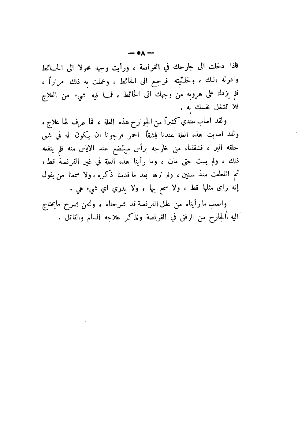وأصعب ما رأيناه من علل القرنصة قد شرحناه، ونحن نشرح ما يحتاج إليه الجارح من الرفق في القرنصة ونذكر علاجه السالم 1والقاتل.