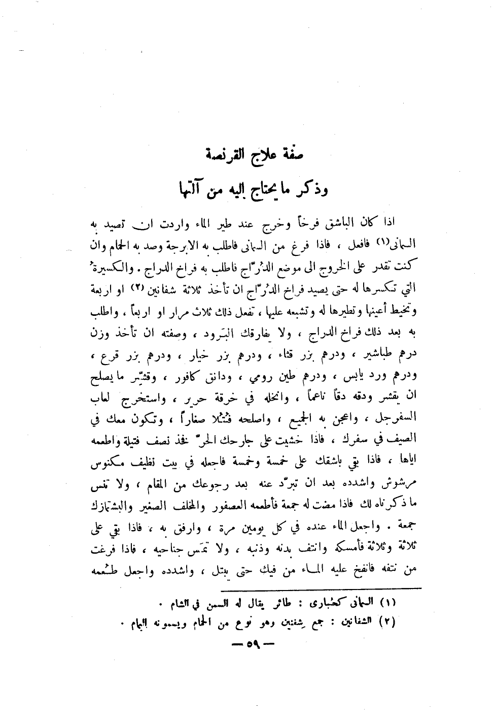 إذا كان الباشق فرخاً وخرج عند طير الماء وأردت أن تصيد به السماني فأفعل، فإذا فرغ من السماني فأطلب به الأبرجة وصد به الحمام وأن كنت تقدر على الخروج إلى موضع الدُرّاج فأطلب به فراخ الدراج. والكسيرةُ التي تكسرها له حتى يصيد فراخ الدُرّاج أن تأخذ ثلاثة شفانين أو أربعة وتخيط أعينها وتطيرها له وتشبعه عليها، تفعل ذلك ثلاث مرار أو أربعاً. وأطلب به بعد ذلك فراخ الدراج، ولا يفارقك البَرود، وصفته أن تأخذ، وزن درهم طباشير، ودرهم بزر قثاء، ودرهم بزر خيار، ودرهم بزر قرع، ودرهم ورد يابس، ودرهم طين روي، ودانق كافور، وقشّير ما يصلح أن يقشر ودقه دقاً ناعماً، وأنخله في خرقة حرير، وأستخرج لعاب السفرجل، وأعجن به الجميع، وأصلحه فُتُلا صغاراً، وتكون معك في الصيف في سفرك، فإذا خشيت على جرحك الحرّ فخذ نصف فتيلة وأطعمه إياها، فإذا بقي باشقك على خمسة وخمسة فأجعله في بيت نظيف مكنوس مرشوش وأشدده بعد أن تبرّد عنه بعد رجوعك من المقام، ولا تنس ما ذكرناه لك فإذا مضت له جمعة فأطعمه العصفور والمخلف الصغير والبشتمازك جمعة. وأجعل الماء عنده في كل يومين مرة، وأرفق به، فإذا بقي على ثلاثة وثلاثة فأمسكه وأنتف بدنه وذنبه، ولا تمَس جناحيه، فإذا فرغت من نتفه فأنفخ عليه الماء من فيك حتى يبتل، وأشدده وأجعل طُعمه