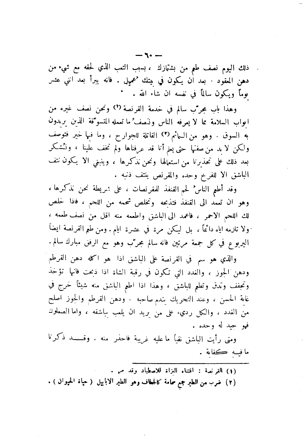 وهذا باب مجرّب سالم في خدمة القرنصة ونحن نصف غيره من أبواب السلامة مما لا يعرفه الناس ونَصفُ ما تعلمه المتسوّقة الذين يريدون به السوق. وهو من السمائم القاتلة للجوارح، وما فيها خير فتوصف ولكن لا بد من صفتها حتى يعلم إنا قد عرفناها ولم تخف علينا، ونُشكر بعد ذلك على تحذيرنا من استعمالها ونحن نذكرها، وينبغي إلا يكون نتف الباشق إلا للفرخ وحده والمقرنص ينتف ذنبه.