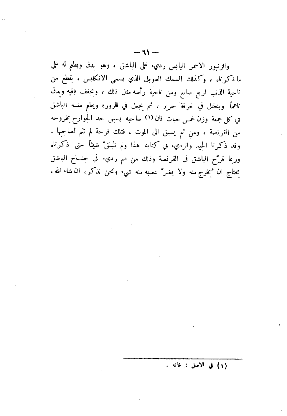 والزنبور الأحمر اليابس رديء على الباشق، وهو يدق ويطعم له على ما ذكرناه، وكذلك السمك الطويل الذي يسمى الانكليس، يقطع من ناحية الذنب أربع أصابع ومن ناحية رأسه مثل ذلك، ويجفف باقيه ويدق ناعماً وينخل في خرقة حرير، ثم يجعل في قارورة ويطعم منه الباشق في كل جمعة وزن خمس حبات فأن صاحبه يسبق حد الجوارح بخروجه من القرنصة، ومن ثم يسبق إلى الموت، فتلك فرحة لم تتم لصاحبها. وقد ذكرنا الجيد والرديء في كتابنا هذا ولم نُبَقّ شيئاً حتى ذكرناه وربما قرّح الباشق في القرنصة وذلك من دم رديء في جناح الباشق يحتاج أن يُخرج منه ولا يضرّ عصبه منه شيء ونحن نذكره إن شاء الله.