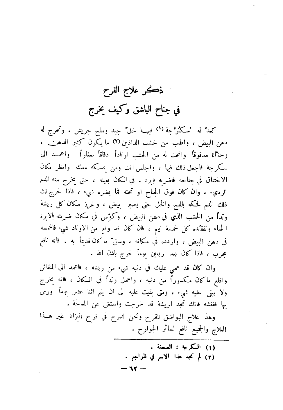 تُعدّ له سُكُرُّجة فيها خلّ جيد وملح جريش، وتخرج له دهن البيض، وأطلب من خشب الداذين ما يكون كثير الدهن، وحنّاءً مدقوقاً وأنحت له من الخشب أوتاداً دقاقاً صغاراً وأعمد إلى سكرجة فأجعل ذلك فيها، وأجلس أنت ومن يمسكه معك وأنظر مكان الاختناق في جناحه فأضربه بإبرة. في المكان بعينه، حتى يخرج منه الدم الرديء، وإن كان فوق الجناح أو تحته فما يضره شيء، فإذا خرج لك ذلك الدم فحكه بالملح والخل حتى يصير أبيض، وأغرز مكان كل ريشة وتداً من الخشب الذي في دهن البيض، وكبِسّ في مكان ضربته بالإبرة الحناء وتفقّده كل خمسة أيام، فإن كان قد وقع من الأوتاد شيء فأغمسه في دهن البيض، واردده في مكانه، وسقّ ما كان قديماً به، فأنه نافع مجرب، فإذا كان بعد أربعين يوماً بأذن الله.