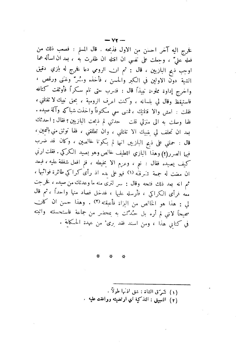 فخرج إليه آخر أحسن من الأول فذبحه، قال المسلم: فصعب ذلك من فعله علّي، وجعلت على نفسي أن أقتله أن ظفرت به، بعد أن اسأله عما أوجب ذبح البازيين، قال: ثم أن الرومي دعا له بازي دقيق الشية دون الأولين في الكبر والحسن، فأخذه وسُرّ وغَنى ورقص، وأخرج إداوة مملوءة نبيذاً قال: فشرب حتى نام سكراً فأوثقت كتافه فأستيقظ وقال لي بلسانه، وكنت أعرف الرومية، بحق نبيك لا تقتلني، فقلت: أمش وإلا قتلتك، فمشى معي مكتوفاً وأخذت شباكه وآلة صيده. فلما وصلت به إلى منزلي قلت حدثني لم ذبحت البازيين؟ فقال: أحدثك بعد أن تحلف لي بنبيك إلا تقتلني، وأن تطلقني، فلما توثق مني باليمين، قال: حملني على ذبح البازيين أنهما لم يكونا خالصين، وكان قد ضرب فيهما الصرر (؟) وهذا البازي اللطيف خالص وهو يصيد الكركي. فقلت أرني كيف يصيده فقال: نعم، وعزم إلا يخيطه، فلم أفعل شفقة عليه، فبعد أن مضت له جمعة شَرقَه فهو على يده إذ رأى كراكي طائرة فواثبها، ثم أنه بعد ذلك فتحه وقال: سر لترى منه ما وعدتك من صيده، فخرجت معه فرأى الكراكي، فأرسله عليها، فدخل فصاد منها واحداً، ثم قال لي: هذا هو الخالص من البزاة فأعبقته. وهذا حسن إن كان صحيحاً لأنني لم أره بل حُدّثت به بمحضر من جماعة فاستحسنته وأثبته في كتابي هذا، ومن أسند فقد برئ من عهدة الحكاية.