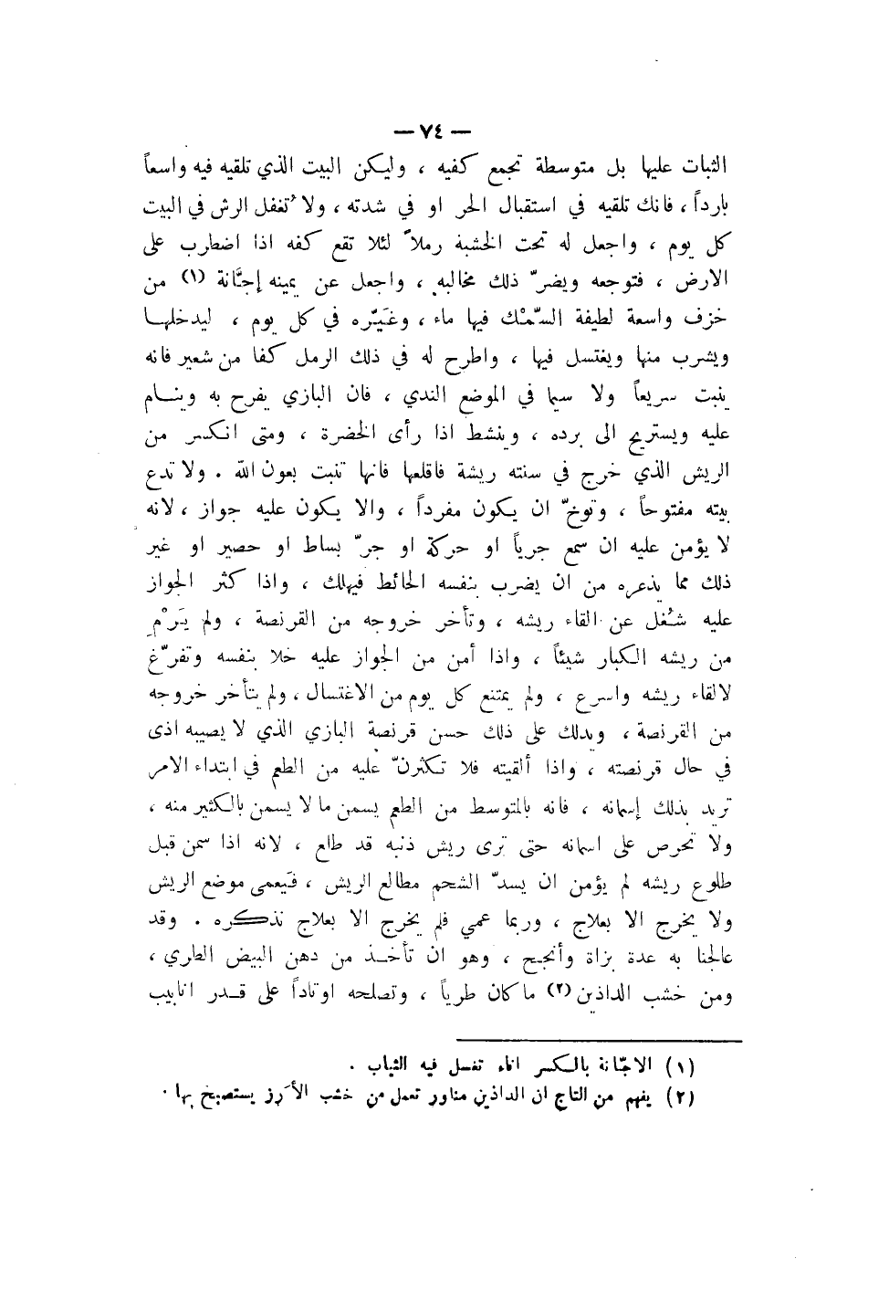 الثبات عليها بل متوسطة تجمع كفيه، وليكن البيت الذي تلقيه فيه واسعاً بارداً، فأنك تلقيه في استقبال الحر أو في شدته، ولا تُغفل الرش في البيت كل يوم، وأجعل له تحت الخشبة رملاً لئلا تقع كفه إذا أضطرب على الأرض، فتوجعه ويضرّ لك مخالبه، وأجعل عن يمينه إجَّانة من خزف واسعة لطيفة السّمْك فيها ماء، وغَيّره في كل يوم، ليدخلها ويشرب منها ويغتسل فيها، وأطرح له في ذلك الرمل كفا من شعير فأنه ينبت سريعاً ولا سيما في الموضع الندي، فأن البازي يفرح به وينام عليه ويستريح إلى برده، وينشط إذا رأى الخضرة، ومتى انكسر من الريش الذي خرج في سنته ريشة فأقلعها فأنها تنبت بعون الله. ولا تدع بيته مفتوحاً، وتوخّ أن يكون مفرداً، وإلا يكون عليه جواز، لأنه لا يؤمن عليه أن سمع جرياً أو حركة أو جرّ بساط أو حصير أو غير ذلك مما يذعره من أن يضرب بنفسه الحائط فيهلك، وإذا كثر الجواز عليه شُغّل عن القاء ريشه، وتأخر خروجه من القرنصة، ولم يَرْمِ من ريشه الكبار شيئاً، وإذا أمن من الجواز عليه خلا بنفسه وتفرّغ لإلقاء ريشه وأسرع، ولم يمتنع كل يوم من الأغتسال، ولم يتأخر خروجه من القرنصة، ويدلك على ذلك حسن قرنصة البازي الذي لا يصيبه أذى في حال قرنصته، وإذا ألقيته فلا تكثرنّ عليه من الطعم في ابتداء الأمر تريد بذلك إسمانه، فأنه بالمتوسط من الطعم يسمن ما لا يسمن بالكثير منه، ولا تحرص على إسمانه حتى ترى ريش ذنبه قد طلع، لأنه إذا سمن قبل طلوع ريشه لم يؤمن أن يسدّ الشحم مطالع الريش، فَيعمى موضع الريش ولا يخرج إلا بعلاج، وربما عمي فلم يخرج إلا بعلاج نذكره. وقد عالجنا به عدة بزاة وأنجح، وهو أن تأخذ من دهن البيض الطري، ومن خشب الداذين ما كان طرياً، وتصلحه أوتاداً على قدر أنابيب