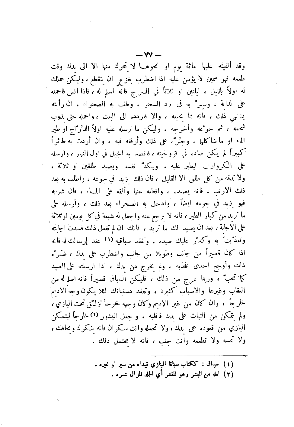 وقد ألقيته عليها مائة يوم أو نحوها لا يتحرك منها إلا إلى يدك وقت طعمه فهو سمين لا يؤمن عليه إذا أضطرب بفزعٍ أن ينقطع، وليكن حملك له أولاً بالليل، ليلتين أو ثلاثاً في السراج فأنه أسلم له، فإذا أنس فأحمله على الدابة، وسِرْ به في برد السحر، وطف به الصحراء أن رأيته يشتهي ذلك، فأنه مما يجيعه، وإلا فأردده إلى البيت، وأحمله حتى يذوب شحمه، ثم جوّعه وأخرجه، وليكن ما ترسله عليه أولاً الدُرّاج أو طير الماء أو ما شاكلهما، وجُرّه على ذلك وأرفقه فيه، وأن أردت به طائراً كبيراً لم يكن صاده في فروخيته، فأقصد به الجبل في أول النهار، وأرسله على الكروان ليطير عليه، ويكدّ نفسه ويصيد طلقين أو ثلاثة، ولا تذقه من كل طلق إلا القليل، فأن ذلك يزيد في جوعه، وأطلب به بعد ذلك الأرنب، فأنه يصيده، وأقطعه عنها وألقه على الماء، فأن شربه فهو يزيد في جوعه أيضاً، وأدخل به الصحراء بعد ذلك، وأرسله على ما تريد من كبار الطير، فأنه لا يرجع عنه وأجعل له شبعة في كل يومين أو ثلاثة على الإجابة، بعد أن يصيد لك ما تريد، فأنك إن لم تفعل ذلك فسدت أجابته وتعذّبتَ وكدّر عليك صيده. وتفقد سباقيه عند إرسالك له فأنه إذا كان قصيراً من جانب وطويلا من جانب واضطرب على يدك، ضَرّه ذلك وأوجع إحدى فخذيه، ولم يخرج من يدك، إذا أرسلته على الصيد كما تحبّ، وربما عرج من ذلك، فليكن السباق قصيراً فأنه أسلم له من العقاب وغيرها والأسباب كثيرة، وتفقد دستبانك لئلا يكون وجه الأديم خارجاً، وإن كان من غير الأديم وكان وجهه خارجاً تزلّق تحت البازي، ولم يتمكن من الثبات على يدك فأقلبه، وأجعل المبشور خارجاً ليتمكن البازي من قعوده على يدك، ولا تحمله وأنت سكران فأنه ينكرك ويخافك، ولا تمسه ولا تطعمه وأنت جنب، فأنه لا يحتمل ذلك.