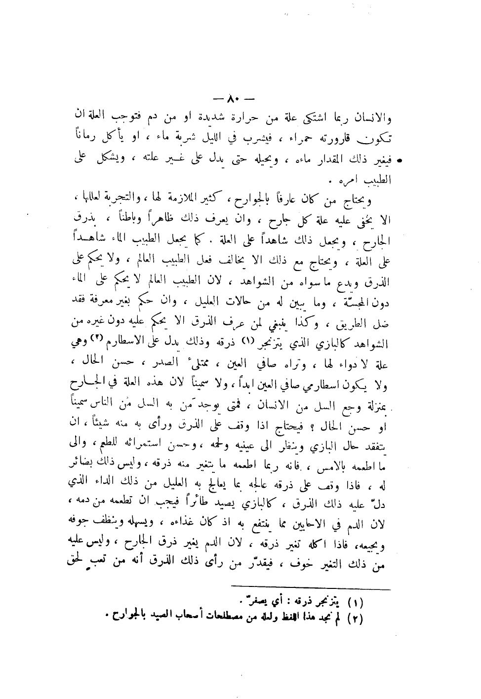 ويحتاج من كان عارفاً بالجوارح، كثير الملازمة لها، والتجربة لعللها، إلا يخفى عليه كل جارح، وأن يعرف ذلك ظاهراً وباطناً، بذرق الجارح، ويجعل ذلك شاهداً على العلة. كما يجعل الطبيب الماء شاهداً على العلة، ويحتاج مع ذلك إلا يخالف فعل الطبيب العالم، ولا يحكم على الذرق ويدع ما سواه من الشواهد، لأن الطبيب العالم لا يحكم على الماء دون المجسّة، وما يبين له من حالات العليل، وأن حكم بغير معرفة فقد ضل الطريق، وكذا ينبغي لمن عرف الذرق إلا يحكم عليه ون غيره من الشاهد كالبازي الذي يتزنجر ذرقه وذلك يدل على الاسطارم وهي علة لا دواء لها، وتراه صافي العين، ممتلئ الصدر، حسن الحال، ولا يكون اسطارمي صافي العين أبداً، ولا سميناً لأن هذه العلة في الجارح بمنزلة وجع السل من الإنسان، فمتى يوجدَ من به السل من الناس سميناً أو حسن الحال؟ فيحتاج إذا وقف على الذرق ورأى به منه شيئاً، أن يتفقد حال البازي وينظر إلى عينيه ولحمه، وحسن استمرائه للطعم، وإلى ما أطعمه بالأمس، فأنه ربما أطعمه ما يتغير منه ذرقه، وليس ذلك بضائر له، فإذا وقف على ذرقه عالجه بما يعالج به العليل من ذلك الداء الذي دلّ عليه ذلك الذرق، كالبازي يصيد طائراً فيجب أن تطعمه من دمه، لأن الدم في الاحايين مما ينتفع به إذا غذاءه، ويسهله وينظف جوفه ويجيعه، فإذا أكله تغير ذرقه، لأن الدم يغير ذرق الجارح، وليس عليه من ذلك التغير خوف، فيقدّر من رأى ذلك الذرق أنه من تعبٍ لحق