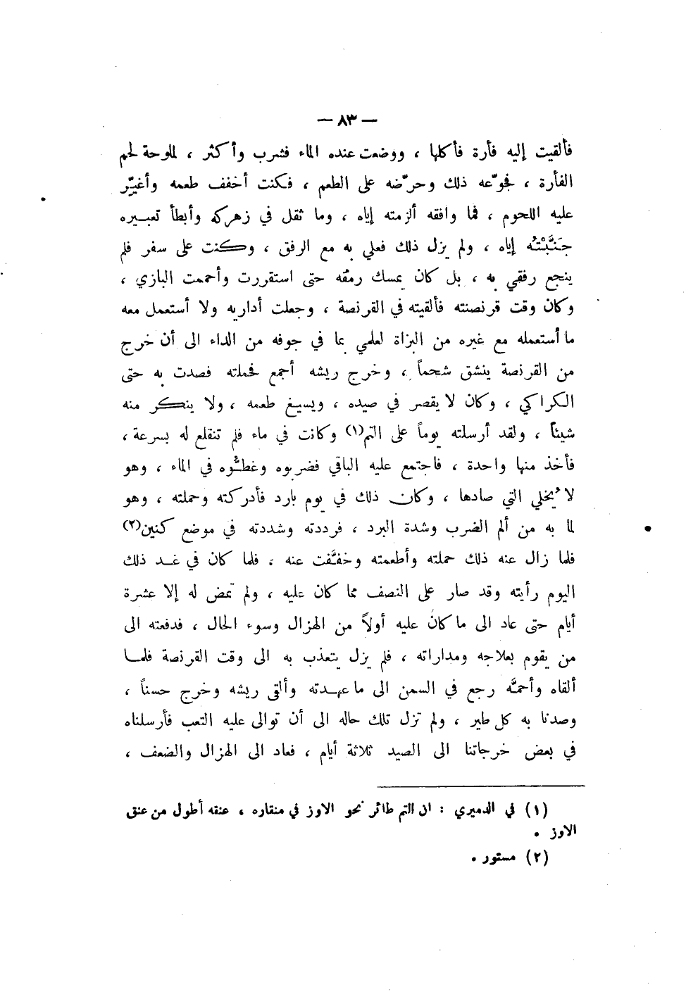 فألقيت إليه فأرة فأكلها، ووضعت عنده الماء فشرب وأكثر، لملوحة لحم الفأرة، فجوّعه ذلك وحرّضه على الطعم، فكنت أخفف طعمه وأغيّر عليه اللحوم، فما وافقه ألزمته إياه، وما ثقل في زهركه وأبطأ تعبيره جَنَّبْتُه إياه، ولم يزل ذلك فعلي به مع الرفق، وكنت على سفر فلم ينجع رفقي به، بل كان يمسك رمقه حتى استقررت وأحممت البازي، وكان وقت قرنصنته فألقيته في القرنصة، وجعلت أداريه ولا أستعمل معه ما أستعمله مع غيره من البزاة لعلمي بما في جوفه من الداء إلى أن خرج من القرنصة ينشق شحماً، وخرج ريشه أجمع فحملته فصدت به حتى الكراكي، وكان لا يقصر في صيده، ويسيغ طعمه، ولا ينكر منه شيئاً، ولقد أرسلته يوماً على التم وكانت في ماء فلم تنقلع له بسرعة، فأخذ منها واحدة، فأجتمع عليه الباقي فضربوه وغطُّوه في الماء، وهو لا يُخلي التي صادها، وكان ذلك في يوم بارد فأدركته وحملته، وهو لما به من ألم الضرب وشدة البرد، فرددته وشددته في موضع كنين فلما زال عنه ذلك حملته وأطعمته وخفَّفت عنه، فلما كان في غد ذلك اليوم رأيته وقد صار على النصف مما كان عليه، ولم تمض له إلا عشرة أيام حتى عاد إلى ما كان إلى كان عليه أولاً من الهزال وسوء الحال، فدفعته إلى من يقوم بعلاجه ومداراته، فلم يزل يتعذب به إلى وقت القرنصة فلما ألقاه وأحمَّه رجع في السمن إلى ما عهدته وألقى ريشه وخرج حسناً، وصدنا به كل طير، ولم تزل تلك حاله إلى أن توالى عليه التعب فأرسلناه في بعض خرجاتنا إلى الصيد ثلاثة أيام، فعاد إلى الهزال والضعف،