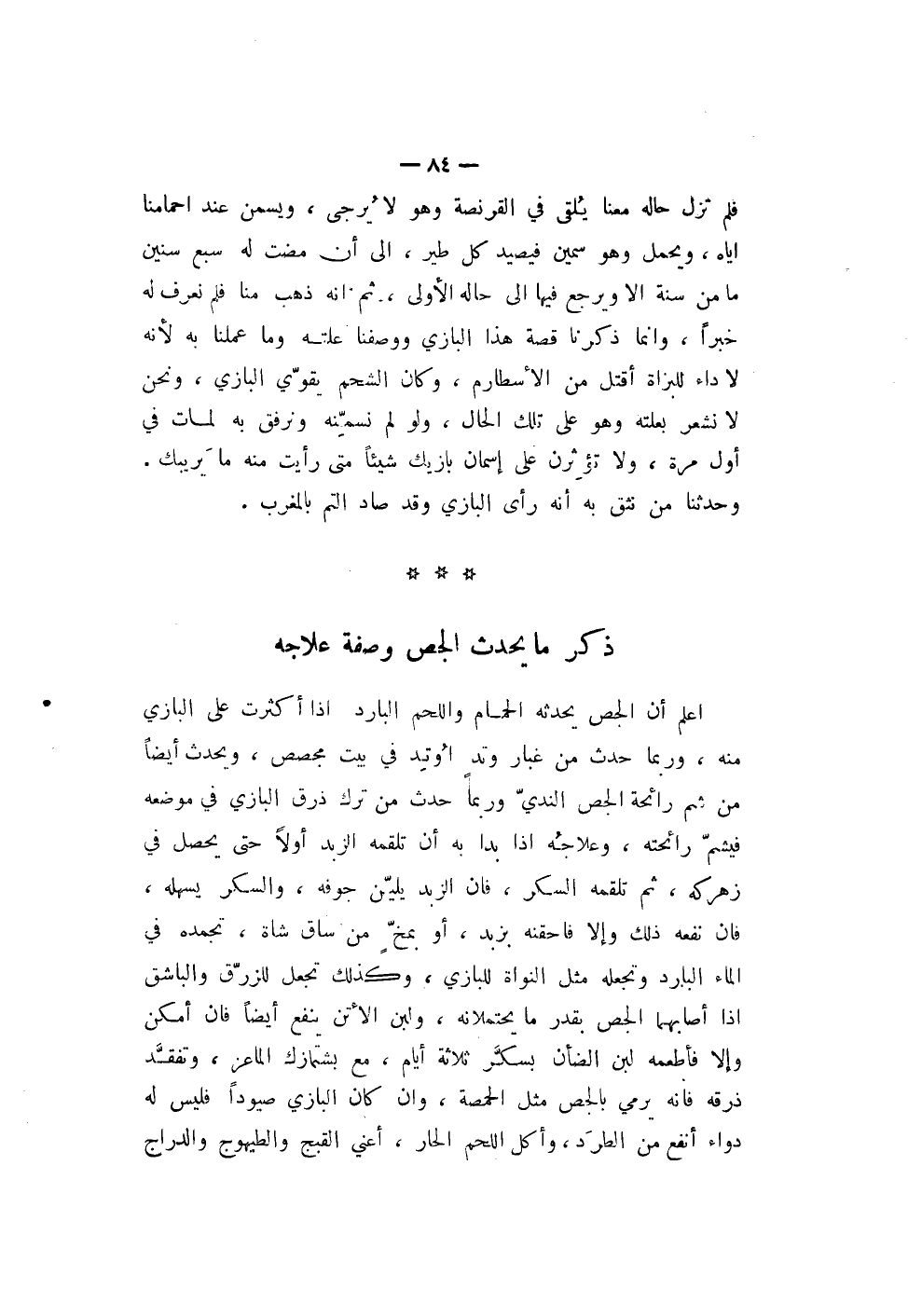 أعلم أن الجص يحدثه الحمام واللحم البارد إذا أكثرت على البازي منه، وربما حدث من غبار وتدٍ اوُتِد في بيت مجصص، ويحدث أيضاً من شم رائحة الجص النديّ وربما حدث من ترك ذرق البازي في موضعه فيشمّ رائحته، وعلاجُه إذا بدا به أن تلقمه الزبد أولاً حتى يحصل في زهركه، ثم تلقمه السكر، فأن الزبد يليّن جوفه، والسكر يسهله، فأن نفعه ذلك وإلا فأحقنه بزبد، أو بمخّ من ساق شاة، تجمده في الماء البارد وتجعله مثل النواة للبازي، وكذلك تجعل للزرّق والباشق إذا أصابهما الجص بقدر ما يحتملانه، ولبن الأتن ينفع أيضاً فأن أمكن وإلا فأطعمه لبن الضأن بسكَّر ثلاثة أيام، مع بشتمازك الماعز، وتفقَّد ذرقه فأنه يرمي بالجص مثل الحمصة، وإن كان البازي صيوداً فليس له دواء أنفع من الطرَد، وأكل اللحم الحار، أعني القبج والطيهوج والدراج