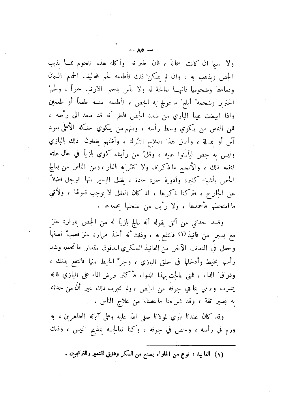 وقد كان عندنا بازي لمولانا صلى الله عليه وعلى آبائه الطاهرين، به ورم في رأسه، وجص في جوفه، وكنا نعالجه بمذبح التيس، وذلك