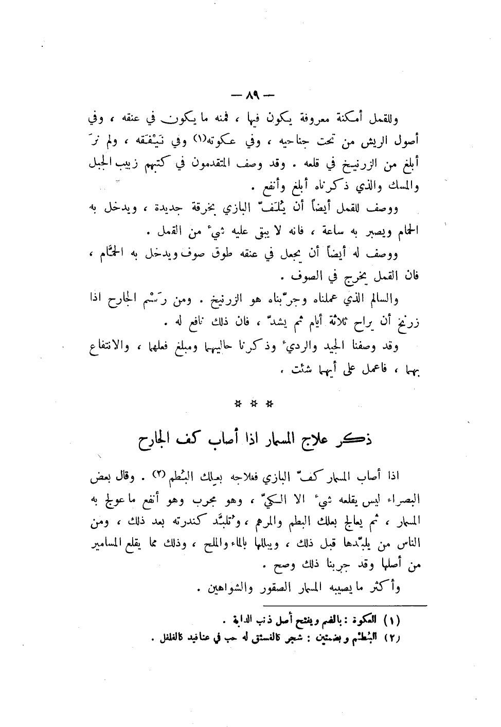 ووصف للقمل أيضاً أن يُلَفّ البازي بخرقة جديدة، ويدخل به الحمام ويصبر به ساعة، فأنه لا يبقى عليه شيء من القمل.