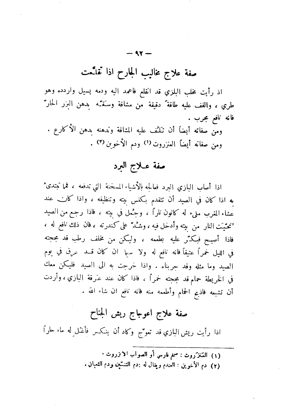 إذا رأيت ريش البازي قد تعوّج وكاد أن ينكسر فأغْلِ له ماء حاراً