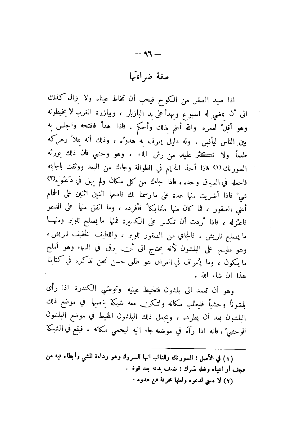 إذا صيد الصقر من الكوخ فيجب أن تخاط عيناه ولا يزال كذلك إلى أن يمضي له أسبوع ويهدأ على يد البازيار، وبيازرة المغرب لا يخيطونه وهو أقلّ لعمره والله أعلم بذلك وأحكم. فإذا هدأ فأفتحه وأجلس به بين الناس ليأنس. وله دليل يعرف به هدوّه، وذلك أنه يملأ زهركه طعماً ولا تكثر عليه من رش الماء، وهو وحشي فأن ذلك يورثه السورنك فإذا أخذ الحَمام في الطوالة وجاءك من البعد ووثقت باجابته فأجعله في السباق وحده، فإذا جاءك من كل مكان ولم يبق في دَعْوِه شيء فإذا أضريت منها عدة على ما رسمنا لك فأدعها اثنين أثنين على الحمام أعني الصقور، فما كان منها مشابكاً فأفرده، وما اتفق منها على الدعو فأعْزله، فإذا أردت أن تكسر على الكسيرة فمنها ما يصلح للوبر ومنها ما يصلح للريش. فالجافي من الصقور للوبر، واللطيف الخفيف للريش، وهو لميح على البلشون لأنه يحتاج إلى أن يرقى في السماء وهو أملح ما يكون، وما يعرف في العراق هو طلق حسن نحن نذكره في كتابنا هذا إن شاء الله.