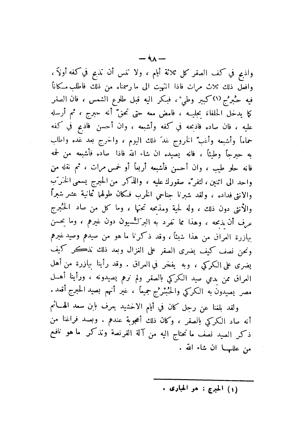 وأذبح في كف الصقر كل ثلاثة أيام، ولا تنس لأن تذبح في كفه أولاً، وأفعل ذلك ثلاث مرات فإذا انتهيت إلى ما رسمناه من ذلك فأطلب مكاناً فيه حُبرُج كبير وطيء، فبكر إليه قبل طلوع الشمس، فأن الصقر كما يدخل الحلفاءَ يجليه، فأمض معه حتى تحقّ أنه جبرج، ثم أرسله عليه، فأن صاده فأذبحه في كفه وأشبعه، وأن أحسن فأذبح في كفه حماماً وأشبعه وأغبّ الخروج غدَ ذلك اليوم، واخرج بعد غده وأطلب به حبرجاً وطيئاً، فأنه يصيده إن شاء الله فإذا صاده فأشبعه من لحمه فأنه حلو طيب، وأن أحسن فأشبعه أربعاً أو خمس مرات، ثم نقله من واحد إلى أثنين، لتفره صقورك عليه، والذكر من الحبرج يسمى الخرَبَ والانثى فداده، ولقد شبرنا جناحي الخرب فكان طولهما ثمانية عشر شبراً والأنثى دون ذلك، وله لحية ومذبحه تحتها، وما كل من صاد الحُبرج عرف أن يذبحه، وهذا مما تفرد به البرَلُّسيون دون غيرهم، وما يحسن بيازرة العراق من هذا شيئاً، وقد ذكرنا ما هو من صيدهم وصيد غيرهم ونحن نصف كيف يضرى الصقر على الغزال وبعد ذلك نذكر كيف يضرى على الكركي، وبه يفخر في العراق. وقد رأينا بيازرة من أهل العراق ممن يدعي صيد الكركي بالصقر ولم نرهم يصيدونه، ورأينا أهل مصر يصيدون به الكركي والحُبْرُج جميعاً، غير أنهم بصيد الحبرج أقعد.