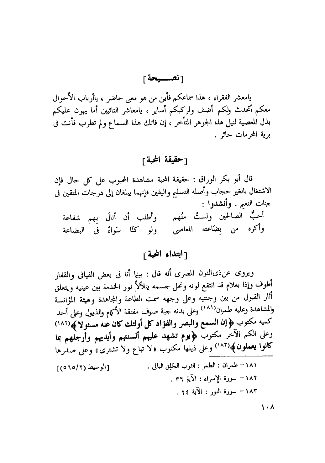 لله درّ أقوام أفناهم شهوده عن وجودهم، فحالهم لشوقه مستديم، أقطعهم إقليم الكرى ما أبعده من إقليم، حماهم عن الأغيار غيرة عليهم، وخلع عليهم حلل الرضا والتسليم، سقاهم مدام الإلهام، فيا له من مدام، ويا له من نديم، أسبل على المعاصي ستره، ليعود إلى بابه الكريم، تقرّب برحمته للمذنبين، ليسكن روع المفلس من الطاعة العديم، أرسل إليه رسائل اللطف على يدي رسول كريم: {قُلْ يَا عِبَادِيَ الَّذِينَ أَسْرَفُوا عَلَى أَنْفُسِهِمْ لا تَقْنَطُوا مِنْ رَحْمَةِ اللَّهِ إِنَّ اللَّهَ يَغْفِرُ الذُّنُوبَ جَمِيعاً إِنَّهُ هُوَ الْغَفُورُ الرَّحِيمُ} الزمر 53.