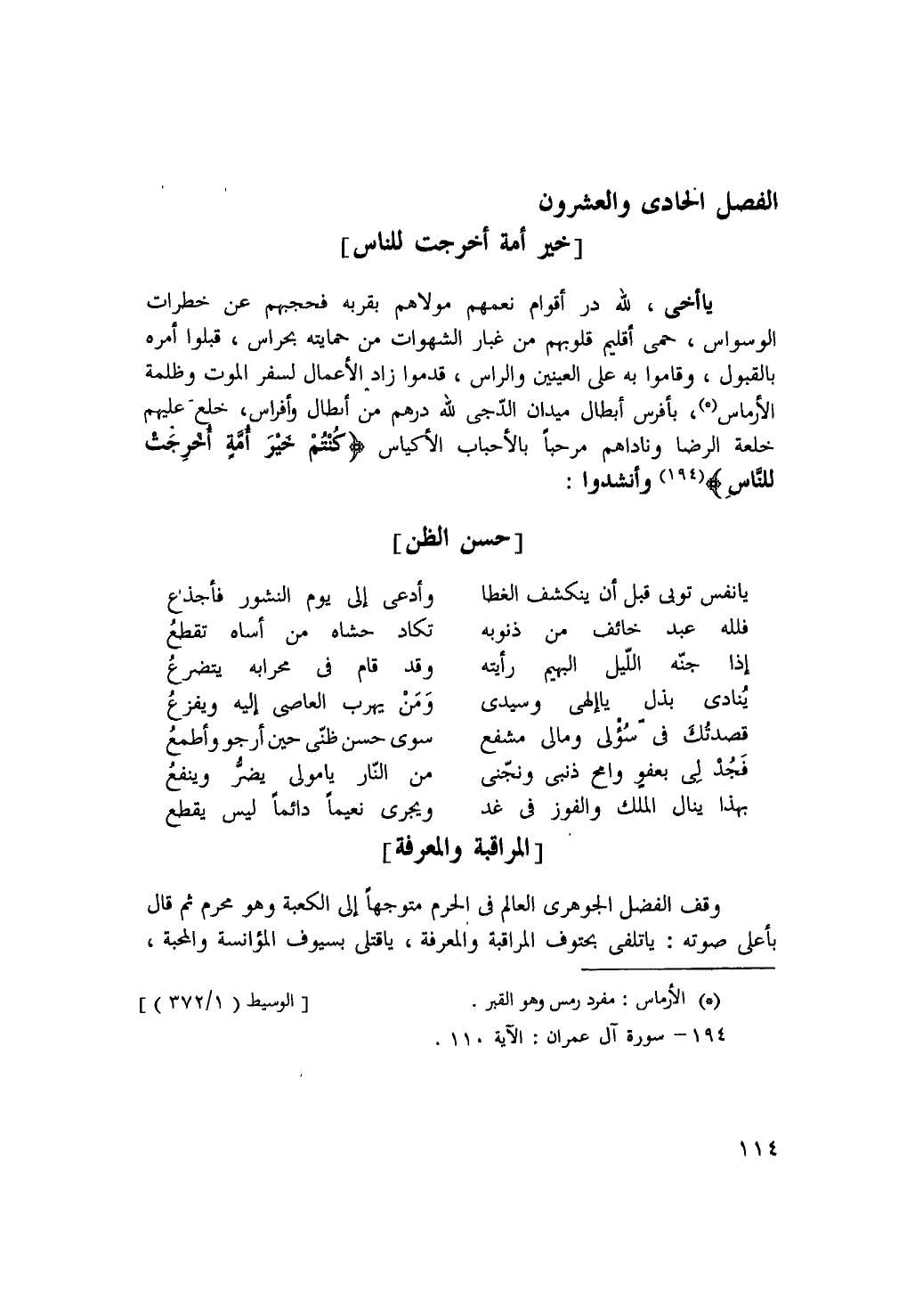 يا هذا، لا يزال التائبون يهربون إلى دير الخلوة هروب الخائف إلى دار الأمان، لهم في سحر الليل تأنس بمدامع الأجفان، كتب السجود في ألواح جباههم خطوط العرفان، كم لأقدامهم في الدجى من جولان وكم لهم في وادي السحر من عيون تجري كالطوفان، فإذا لاحت أعلام الفجر كبّروا عند مشاهدة العيان، فديت طراق الدجى، فديت أرباب العزائم، فديت الفتيان.