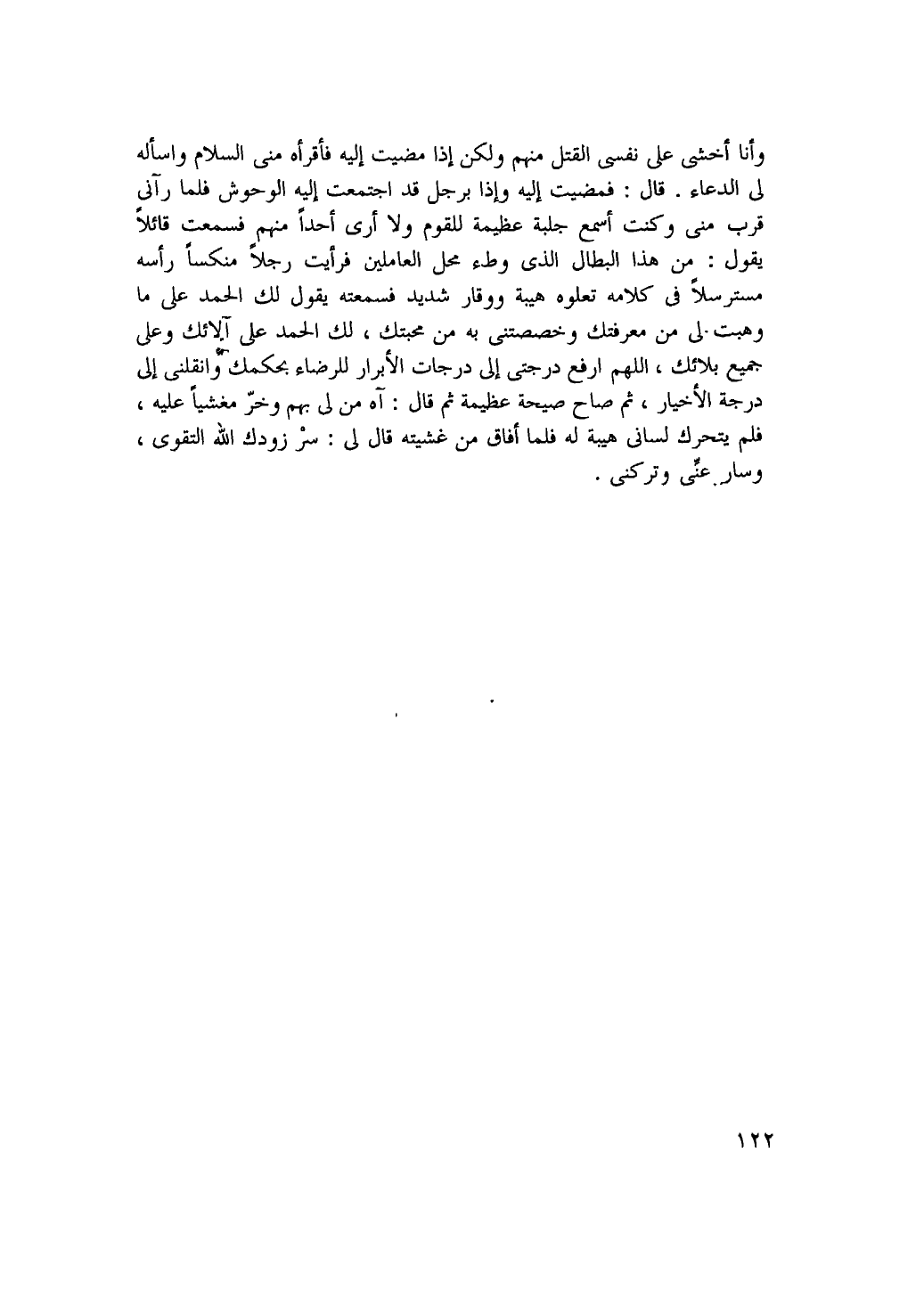 فلما بلغ المنشار إلى دماغه، تأوّه، فأوحى الله تعالى إلى جبريل عليه السلام: قل له: لا ينطق بشيء، وها أنا أنظر إليك، وقد أبكى حملة عرشي، وسكان سماواتي، فوعزتي وجلالي لئن تأوّه الثانية، لأهدمنّ السموات على الأرض، فما تأوه ولا تكلم حتى مات رحمه الله.