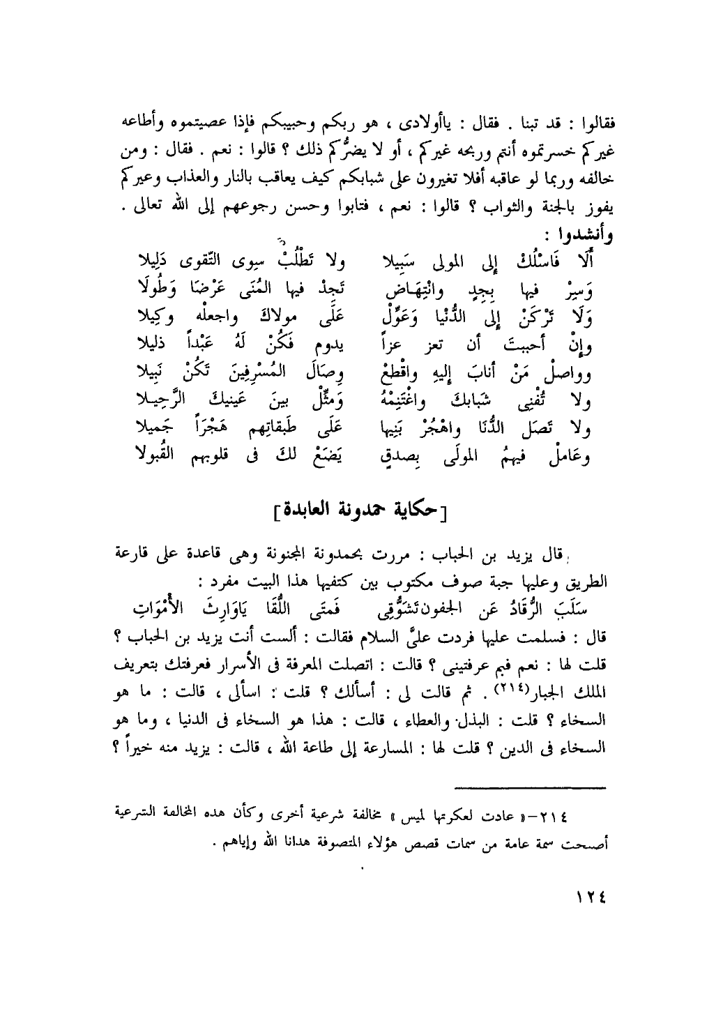 وفي الخبر أن النبي صَلَّى اللهُ عَلَيْهِ وَسَلَّمَ فقد كعبا فسأل عنه، فقيل إنه مريض، فخرج يمشي حتى أتاه، فلما دخل عليه قال: "أبشر يا كعب"، فقالت له أمه: هنيئا لك الجنة يا كعب. فقال رسول الله صَلَّى اللهُ عَلَيْهِ وَسَلَّمَ: "من هذه المتألية على الله؟ " قال: أمي. قال: "وما يدريك يا أم كعب، لعل كعبا قال ما لا يعنيه أو سمع ما لا يعنيه؟ ".
