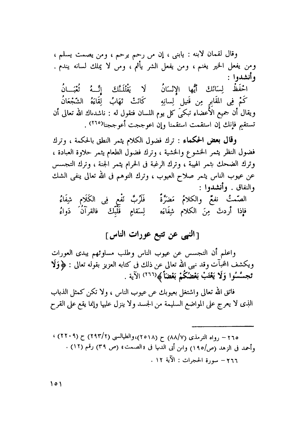 قيل يا رسول الله، فما الثلاثة التي تصيبه عند لقاء ربه؟ قال: "يلقى الله تعالى وهو غضبان عليه، ويبعث الله له ملكا يكّبه على وجهه في النار، ويعذبه الله تعالى بالوادي الذي يقال له ويل" (¬1) .