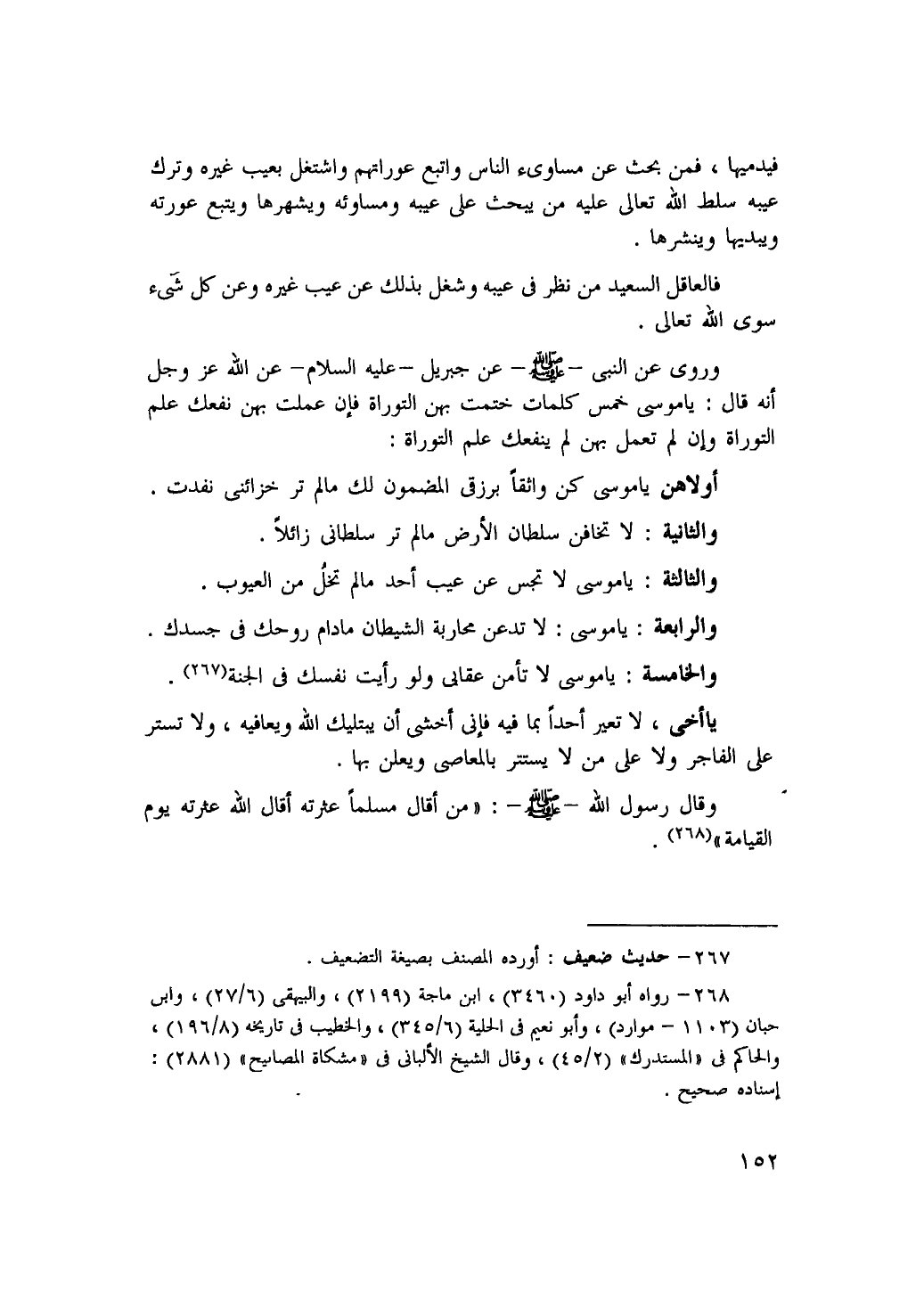 والرابع: مانع الزكاة. والخامس: شاهد الزور. والسادس: الماشي بين الناس بالنميمة. والسابع: الذي ينظر لوالديه بنظر الغضب. والثامن: من يطلق زوجته ثم يمسكها على الحرام. والتاسع: الذي يحكم بالجور. والعاشر: تارك الصلاة على صحة البدن".