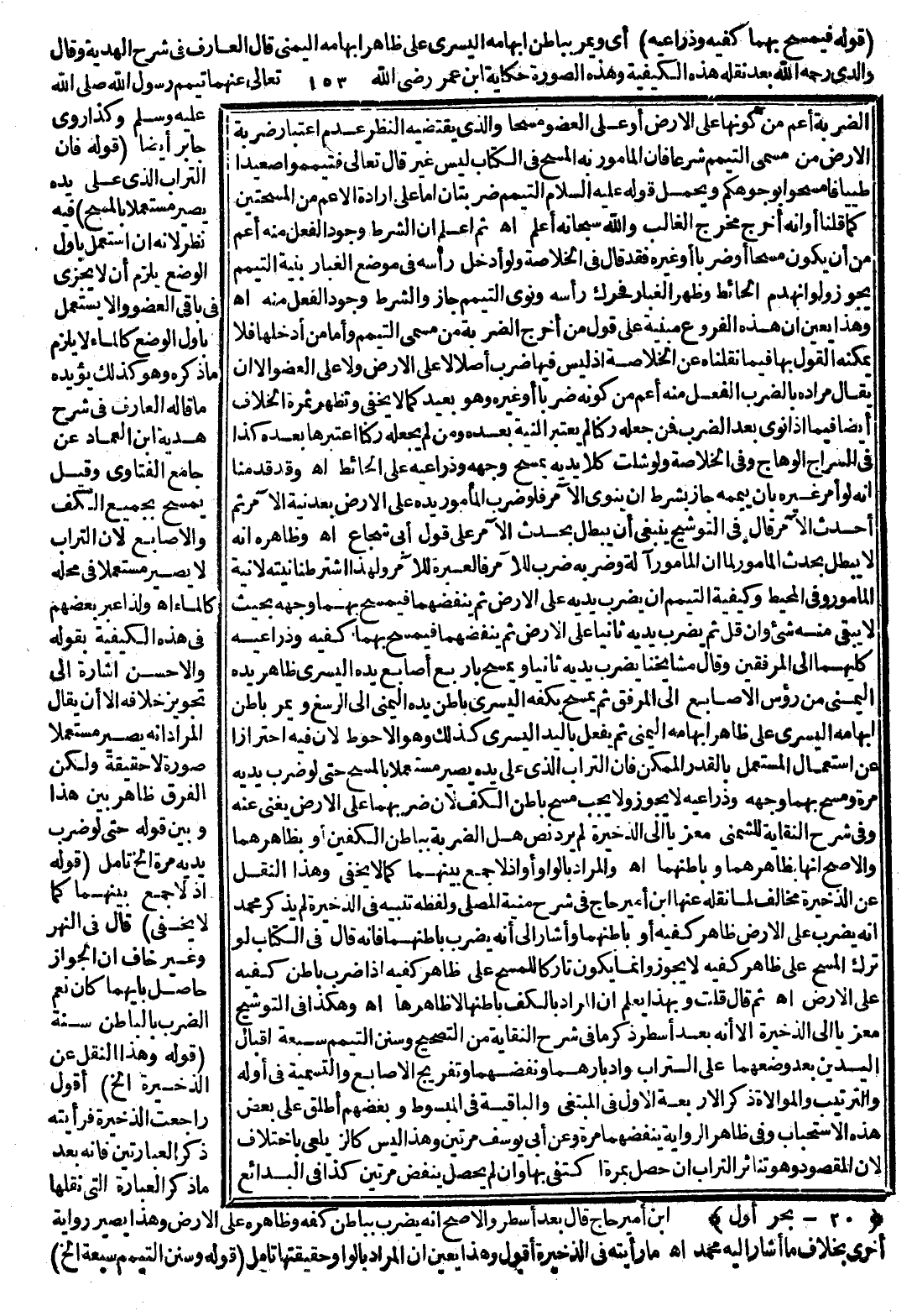 (قَوْلُهُ: فَيَمْسَحُ بِهِمَا كَفَّيْهِ وَذِرَاعَيْهِ) أَيْ وَيُمِرُّ بِبَاطِنِ إبْهَامِهِ الْيُسْرَى عَلَى ظَاهِرِ إبْهَامِهِ الْيُمْنَى قَالَ الْعَارِفُ فِي شَرْحِ الْهِدَايَةِ وَقَالَ وَالِدِي - رَحِمَهُ اللَّهُ - بَعْدَ نَقْلِهِ هَذِهِ الْكَيْفِيَّةَ وَهَذِهِ الصُّورَةَ حِكَايَةُ ابْنِ عُمَرَ - رَضِيَ اللَّهُ تَعَالَى عَنْهُمَا - «تَيَمَّمَ رَسُولُ اللَّهِ - صَلَّى اللَّهُ عَلَيْهِ وَسَلَّمَ -» وَكَذَا رَوَى جَابِرٌ أَيْضًا (قَوْلُهُ: فَإِنَّ التُّرَابَ الَّذِي عَلَى يَدِهِ يَصِيرُ مُسْتَعْمَلًا بِالْمَسْحِ) فِيهِ نَظَرٌ؛ لِأَنَّهُ إنْ اُسْتُعْمِلَ بِأَوَّلِ الْوَضْعِ يَلْزَمُ أَنْ لَا يُجْزِئَ فِي بَاقِي الْعُضْوِ، وَإِلَّا يُسْتَعْمَلْ بِأَوَّلِ الْوَضْعِ كَالْمَاءِ لَا يَلْزَمُ مَا ذَكَرَهُ، وَهُوَ كَذَلِكَ يُؤَيِّدُهُ مَا قَالَهُ الْعَارِفُ فِي شَرْحِ هَدِيَّةِ ابْنِ الْعِمَادِ عَنْ جَامِعِ الْفَتَاوَى وَقِيلَ يَمْسَحُ بِجَمِيعِ الْكَفِّ وَالْأَصَابِعِ؛ لِأَنَّ التُّرَابَ لَا يَصِيرُ مُسْتَعْمَلًا فِي مَحَلِّهِ كَالْمَاءِ اهـ.