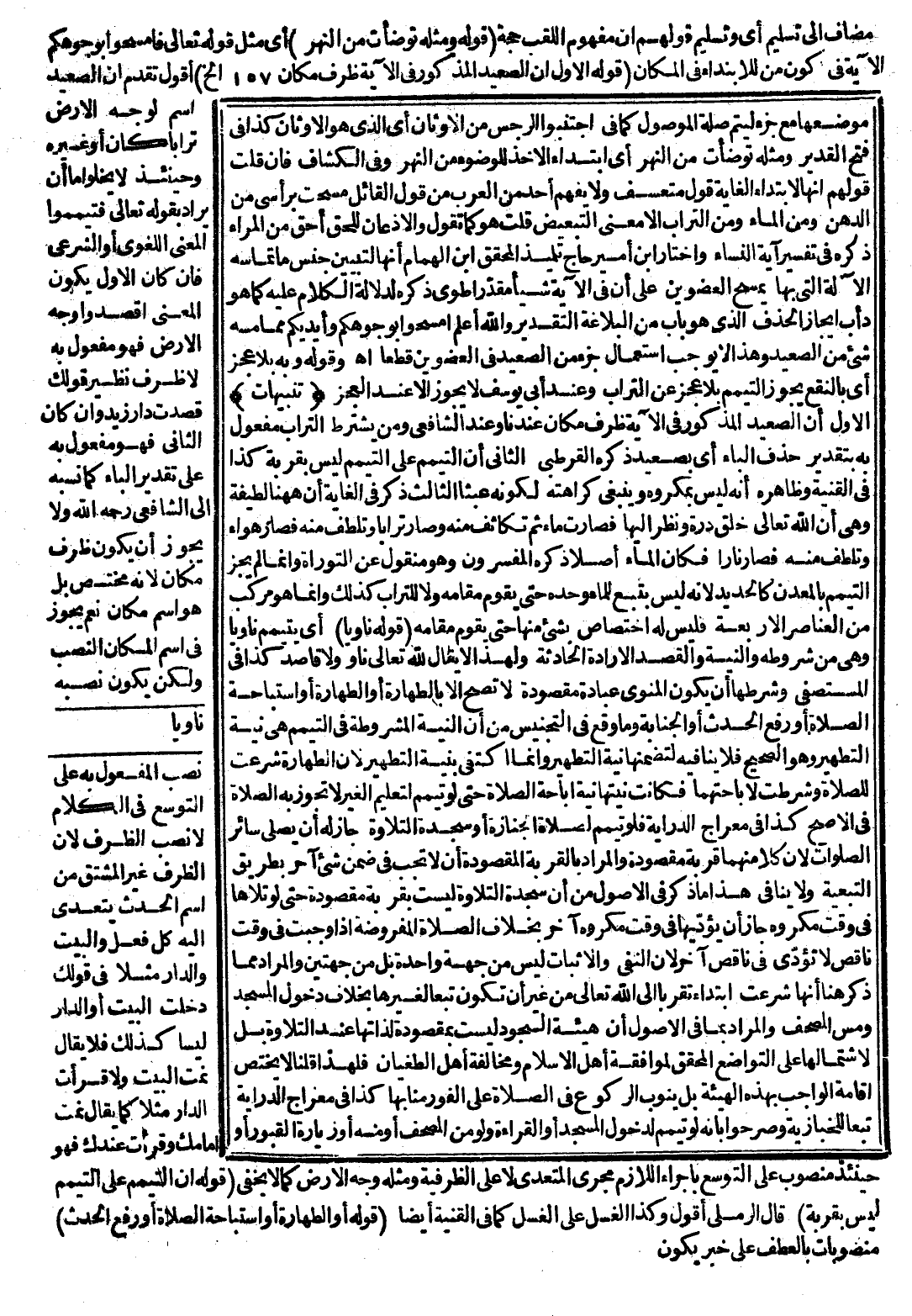 (قَوْلُهُ: وَمِثْلُهُ تَوَضَّأْت مِنْ النَّهْرِ) أَيْ مِثْلُ قَوْله تَعَالَى {فَامْسَحُوا بِوُجُوهِكُمْ} [النساء: 43] الْآيَةُ فِي كَوْنِ مِنْ لِلِابْتِدَاءِ فِي الْمَكَانِ (قَوْلُهُ: الْأَوَّلُ أَنَّ الصَّعِيدَ الْمَذْكُورَ فِي الْآيَةِ ظَرْفُ مَكَان إلَخْ) أَقُولُ: تَقَدَّمَ أَنَّ الصَّعِيدَ اسْمٌ لِوَجْهِ الْأَرْضِ تُرَابًا كَانَ أَوْ غَيْرَهُ وَحِينَئِذٍ لَا يَخْلُو إمَّا أَنْ يُرَادَ بِقَوْلِهِ تَعَالَى {فَتَيَمَّمُوا} [النساء: 43] الْمَعْنَى اللُّغَوِيَّ أَوْ الشَّرْعِيَّ، فَإِنْ كَانَ الْأَوَّلُ يَكُونُ الْمَعْنَى اقْصِدُوا وَجْهَ الْأَرْضِ فَهُوَ مَفْعُولٌ بِهِ لَا ظَرْفٌ نَظِيرُ قَوْلِك قَصَدْت دَارَ زَيْدٍ، وَإِنْ كَانَ الثَّانِي فَهُوَ مَفْعُولٌ بِهِ عَلَى تَقْدِيرِ الْبَاءِ كَمَا نَسَبَهُ إلَى الشَّافِعِيِّ - رَحِمَهُ اللَّهُ - وَلَا يَجُوزُ أَنْ يَكُونَ ظَرْفَ مَكَان؛ لِأَنَّهُ مُخْتَصٌّ بَلْ هُوَ اسْمُ مَكَان نَعَمْ يَجُوزُ فِي اسْمِ الْمَكَانِ النَّصْبُ وَلَكِنْ يَكُونُ نَصْبُهُ نَصْبُ الْمَفْعُولِ بِهِ عَلَى التَّوَسُّعِ فِي الْكَلَامِ لَا نَصْبُ الظَّرْفِ؛ لِأَنَّ الظَّرْفَ غَيْرَ الْمُشْتَقِّ مِنْ اسْمِ الْحَدَثِ يَتَعَدَّى إلَيْهِ كُلُّ فِعْلٍ وَالْبَيْتُ وَالدَّارُ مَثَلًا فِي قَوْلِك دَخَلْت الْبَيْتَ أَوْ الدَّارَ لَيْسَا كَذَلِكَ فَلَا يُقَالُ نِمْت الْبَيْتَ وَلَا قَرَأْت الدَّارَ مَثَلًا كَمَا يُقَالُ نِمْت أَمَامَك وَقَرَأْت عِنْدَك فَهُوَ حِينَئِذٍ مَنْصُوبٌ عَلَى التَّوَسُّعِ بِإِجْرَاءِ اللَّازِمِ مَجْرَى الْمُتَعَدِّي لَا عَلَى الظَّرْفِيَّةِ وَمِثْلُهُ وَجْهُ الْأَرْضِ كَمَا لَا يَخْفَى (قَوْلُهُ: إنَّ التَّيَمُّمَ عَلَى التَّيَمُّمِ لَيْسَ بِقُرْبَةٍ) قَالَ الرَّمْلِيُّ أَقُولُ: وَكَذَا الْغُسْلُ عَلَى الْغُسْلِ كَمَا فِي الْقُنْيَةِ أَيْضًا.