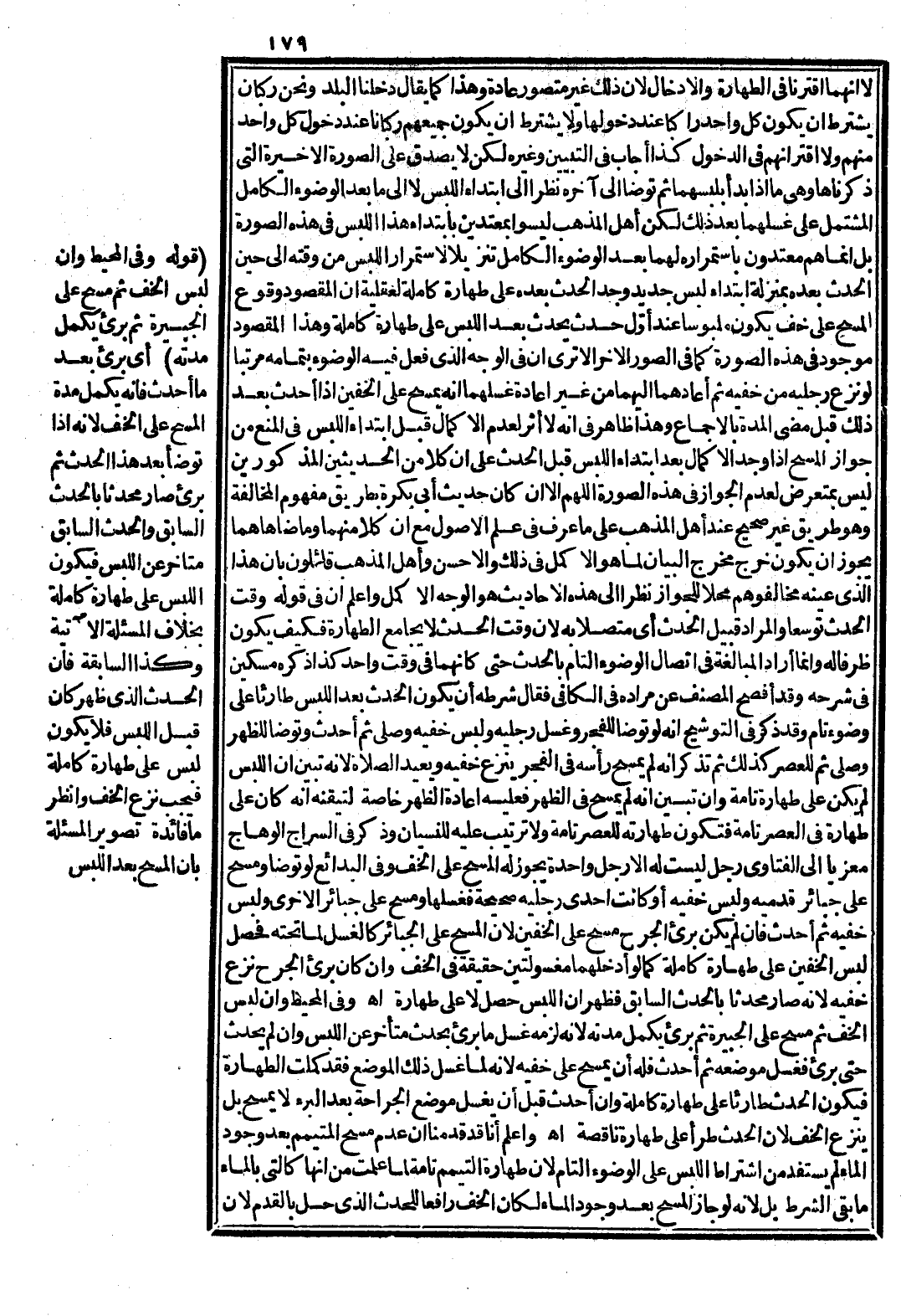 وَاعْلَمْ أَنَّ فِي قَوْلِهِ وَقْتَ الْحَدَثِ تَوَسُّعًا وَالْمُرَادُ قُبَيْلَ الْحَدَثِ أَيْ مُتَّصِلًا بِهِ؛ لِأَنَّ وَقْتَ الْحَدَثِ لَا يُجَامِعُ الطَّهَارَةَ فَكَيْفَ يَكُونُ ظَرْفًا لَهُ، وَإِنَّمَا أَرَادَ الْمُبَالَغَةَ فِي اتِّصَالِ الْوُضُوءِ التَّامِّ بِالْحَدَثِ حَتَّى كَأَنَّهُمَا فِي وَقْتٍ وَاحِدٍ كَذَا ذَكَرَهُ مِسْكِينٌ فِي شَرْحِهِ وَقَدْ أَفْصَحَ الْمُصَنِّفُ عَنْ مُرَادِهِ فِي الْكَافِي فَقَالَ شَرْطُهُ أَنْ يَكُونَ الْحَدَثُ بَعْدَ اللُّبْسِ طَارِئًا عَلَى وُضُوءٍ تَامٍّ وَقَدْ ذُكِرَ فِي التَّوْشِيحِ أَنَّهُ لَوْ تَوَضَّأَ لِلْفَجْرِ وَغَسَلَ رِجْلَيْهِ وَلَبِسَ خُفَّيْهِ وَصَلَّى ثُمَّ أَحْدَثَ وَتَوَضَّأَ لِلظُّهْرِ وَصَلَّى ثُمَّ لِلْعَصْرِ كَذَلِكَ ثُمَّ تَذَكَّرَ أَنَّهُ لَمْ يَمْسَحْ رَأْسَهُ فِي الْفَجْرِ يَنْزِعُ خُفَّيْهِ وَيُعِيدُ الصَّلَاةَ؛ لِأَنَّهُ تَبَيَّنَ أَنَّ اللُّبْسَ لَمْ يَكُنْ عَلَى طَهَارَةٍ تَامَّةٍ